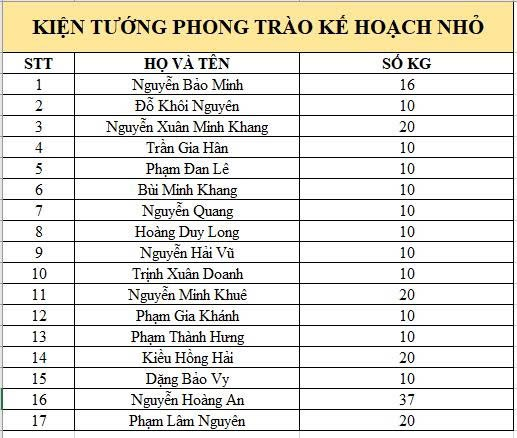 Thực hiện phong trào “ Kế hoạch nhỏ” của thiếu nhi năm học 2025- 2026 do Liên đội Ngọc Khánh phát động, nhằm nâng cao hiệu quả công tác giáo dục Thiếu nhi thông qua các hoạt động phong trào, giáo dục ý thức tiết kiệm, tình yêu lao động, trách nhiệm cộng đồng, qua đó góp phần thúc đẩy thiếu nhi tích cực tham gia các hoạt động mang lại lợi ích xã hội. Trong sáng qua ngày 2/2/ 2026, các bạn học sinh lớp 2A5 – trường Tiểu học Ngọc Khánh đã tham gia nhiệt tình, tích cực thu gom giấy vụn, từng tấm bìa, giấy báo, sách cũ... được 325 kg (trung bình đạt 8kg /1 học sinh) với nhiều cá nhân đạt mức KIỆN TƯỚNG của lớp, trường. Tiêu biểu tuyên dương 17 bạn đạt mức “ Kiện tướng Kế hoạch nhỏ” của lớp.