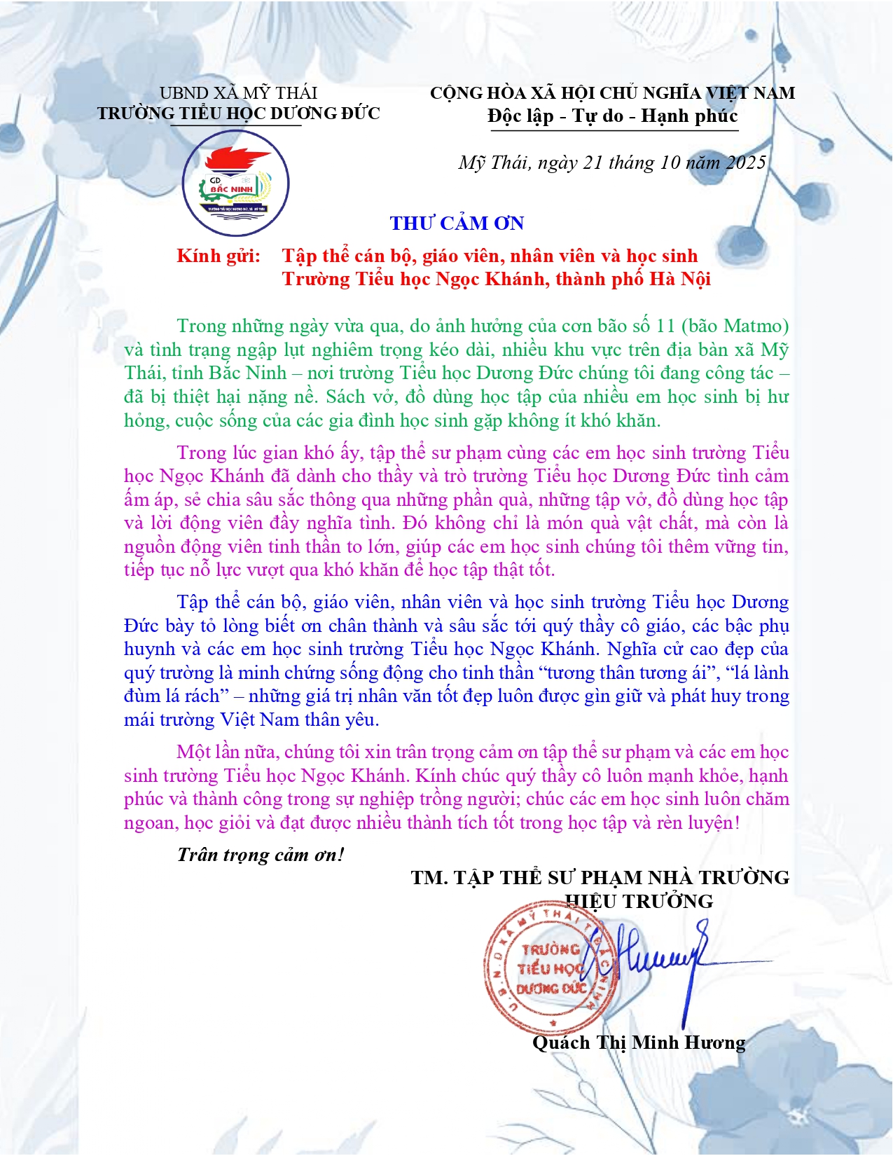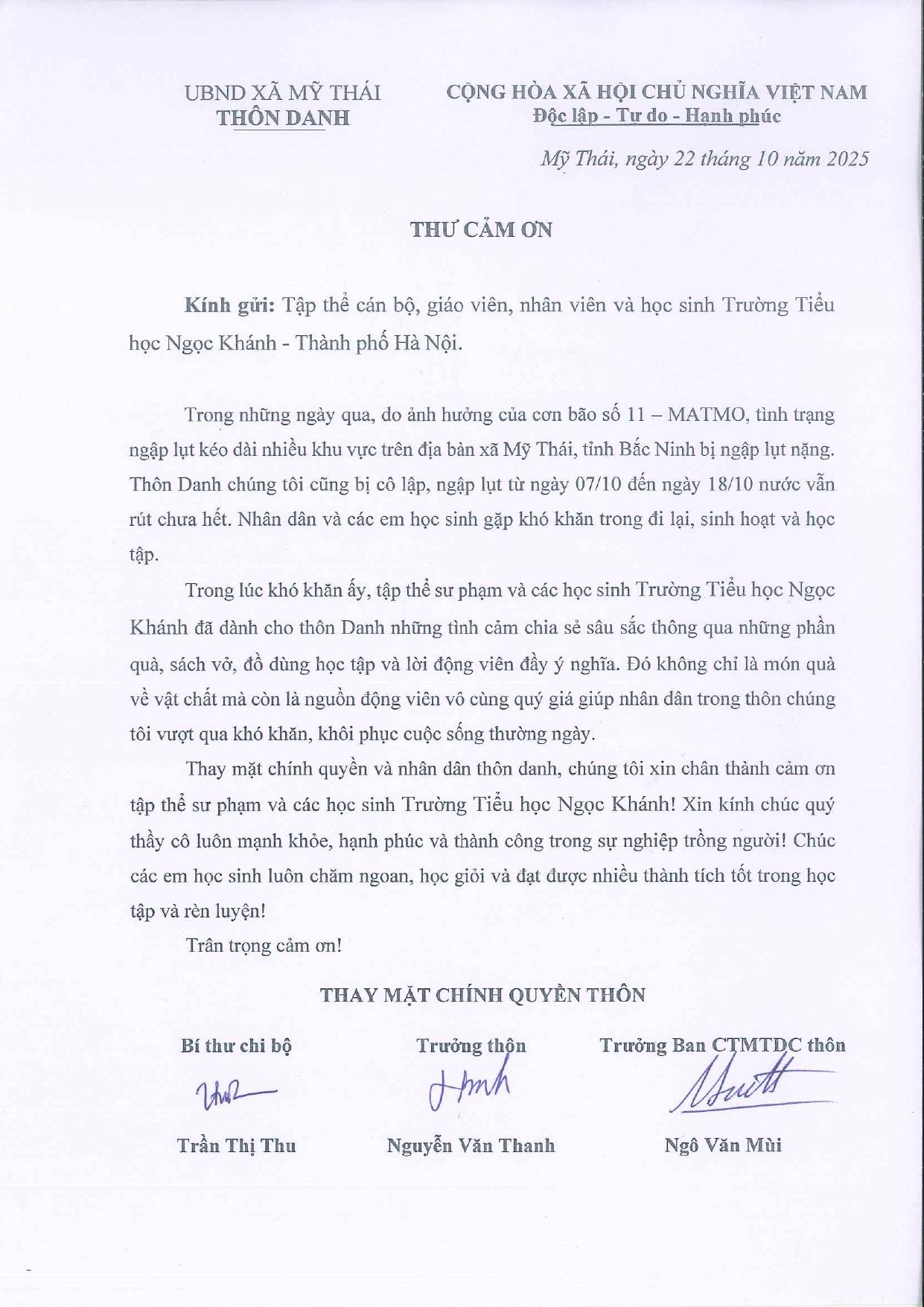 Sáng 21/10/2025 và 23/10/2025 đoàn từ thiện trường TH Ngọc Khánh do cô giáo Hoàng Thị Thanh Ngọc – Phó Bí thư chi bộ, Phó Hiệu trưởng nhà trường làm trưởng đoàn đã tới các tỉnh Bắc Ninh và Thái Nguyên trực tiếp trao quà tại ba điểm trường và một thôn bị ảnh hưởng nặng nề bởi mưa lũ.