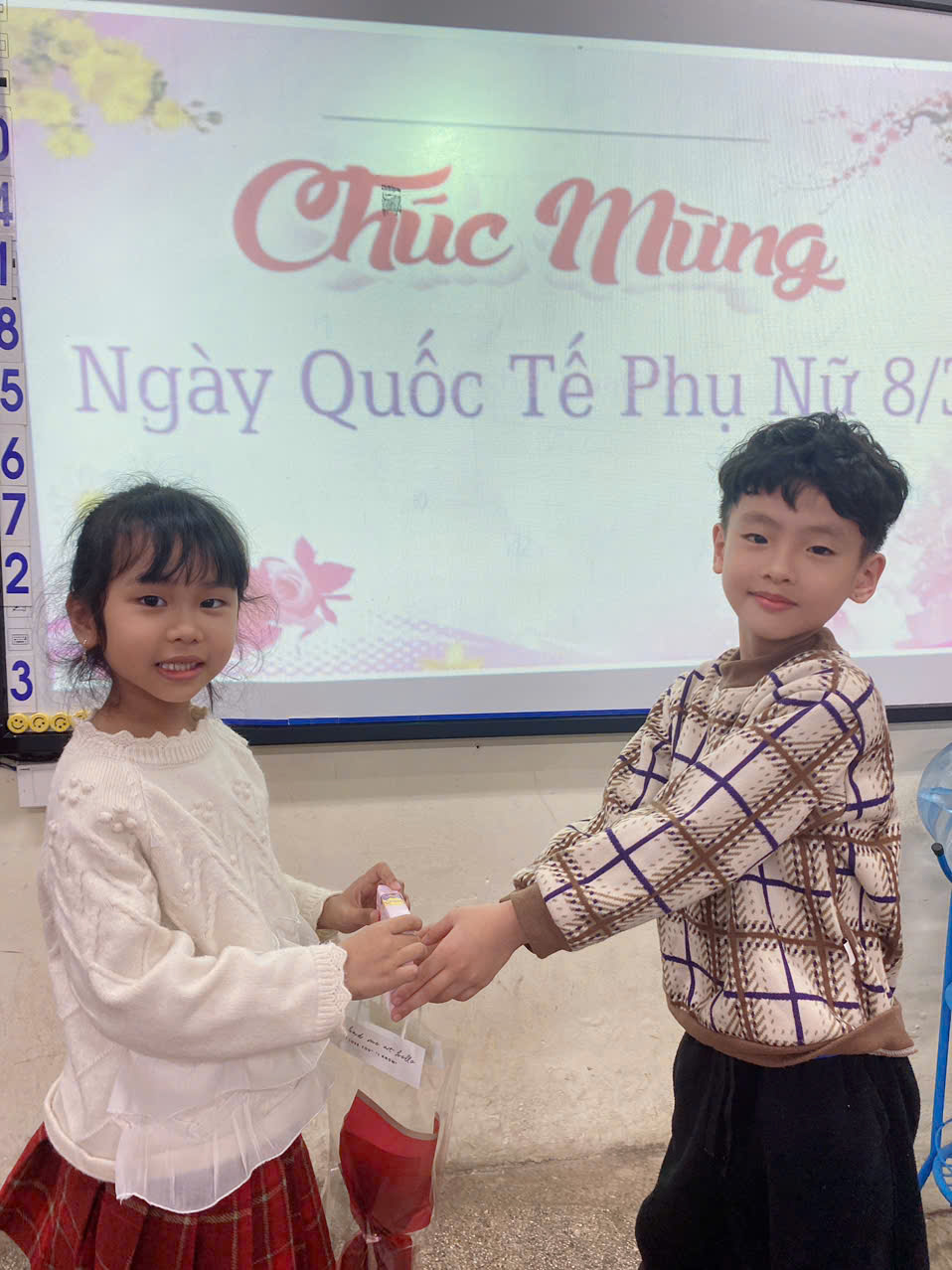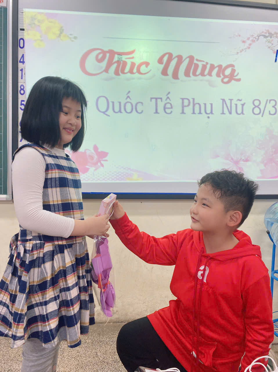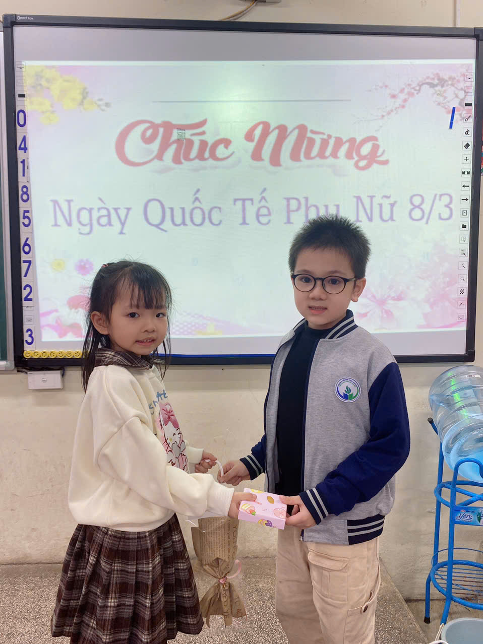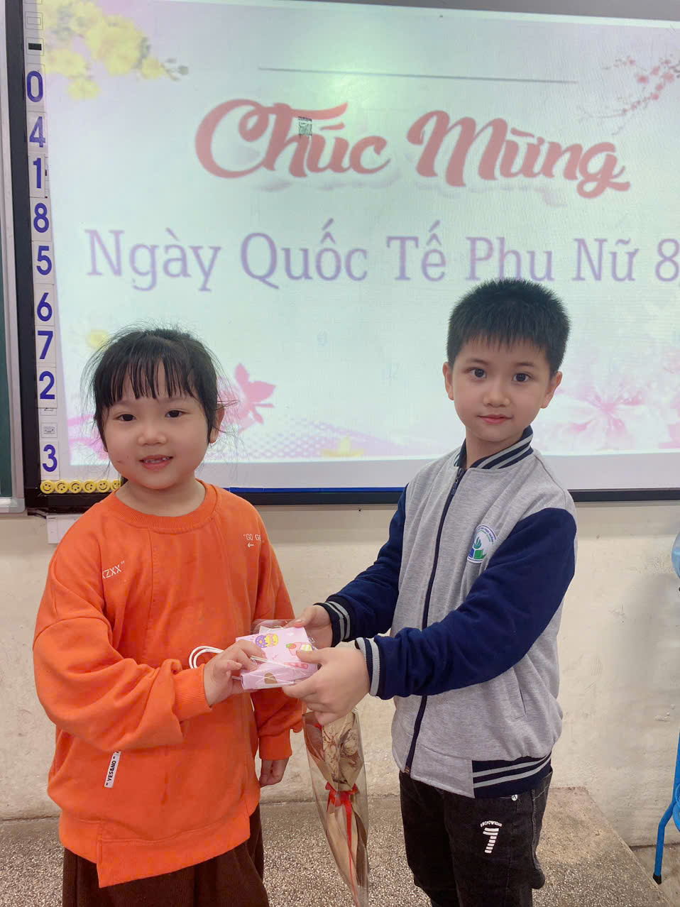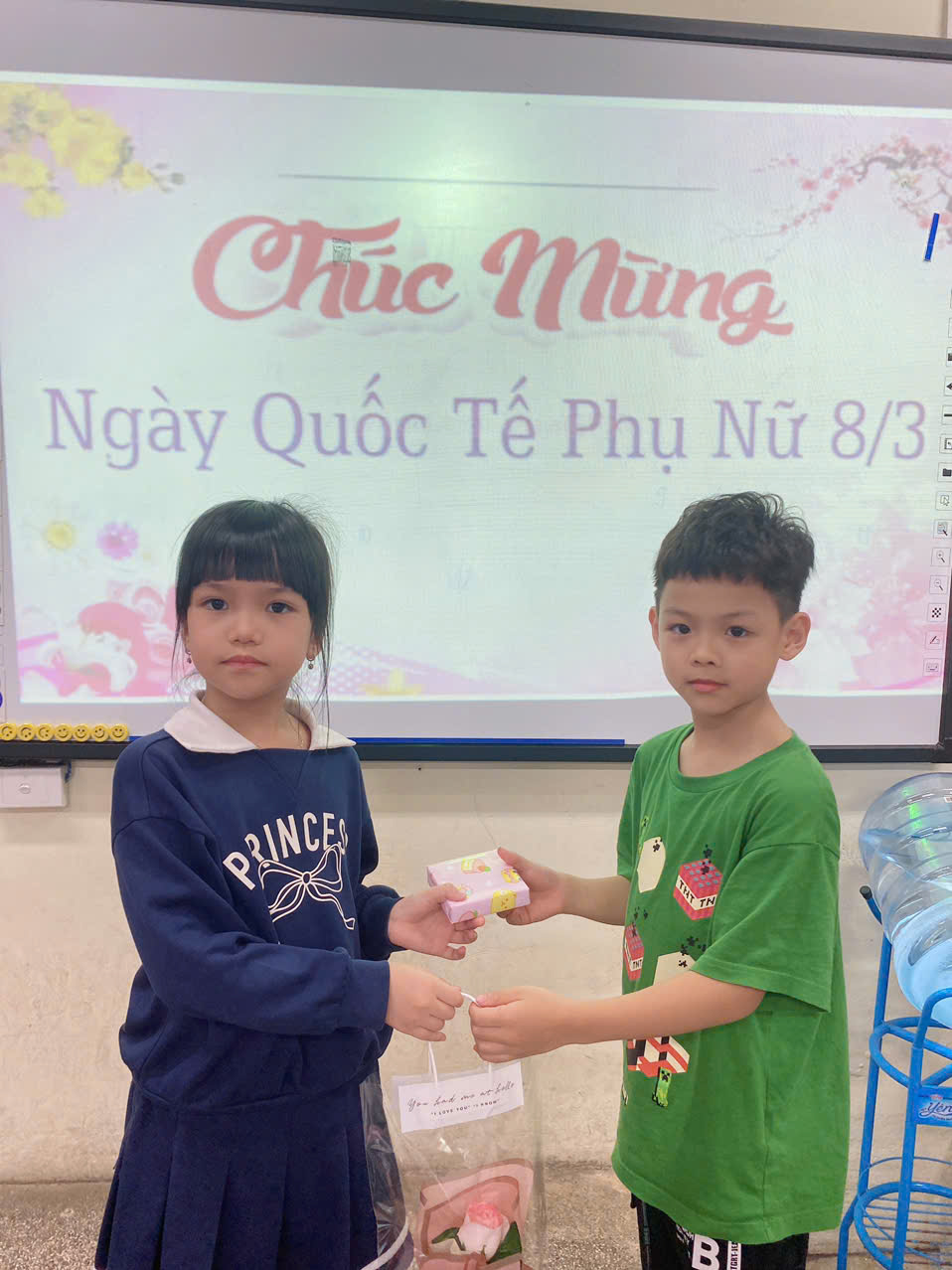 Trong chương trình, các bạn nam đã đại diện trao những bông hoa và món quà nhỏ xinh đến các bạn nữ như một lời chúc dễ thương và chân thành. Những nụ cười rạng rỡ, ánh mắt hồn nhiên và những tràng pháo tay vang lên khắp lớp học đã tạo nên bầu không khí vô cùng ấm áp và đáng nhớ.