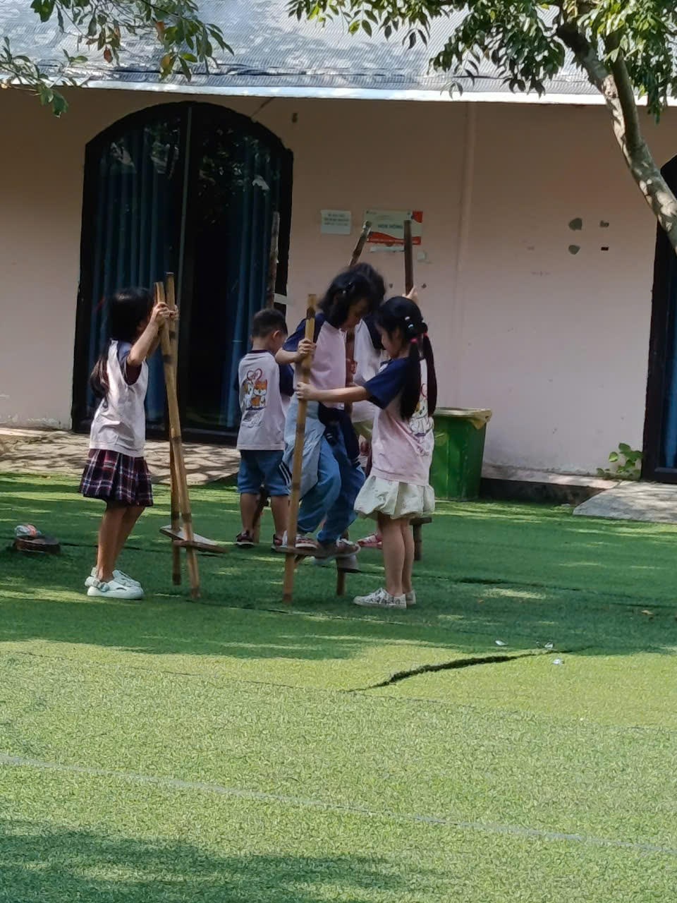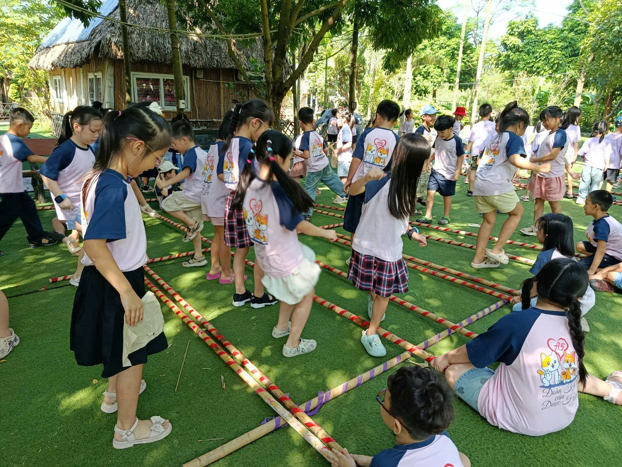 Ngoài ra, tiếng cười và sự sôi nổi còn lan tỏa khắp khu vực trò chơi vận động. Các em cùng nhau chinh phục thử thách trượt cỏ, nhảy sạp, kéo co, đi cà kheo,… rèn luyện sự dẻo dai và tinh thần đồng đội.