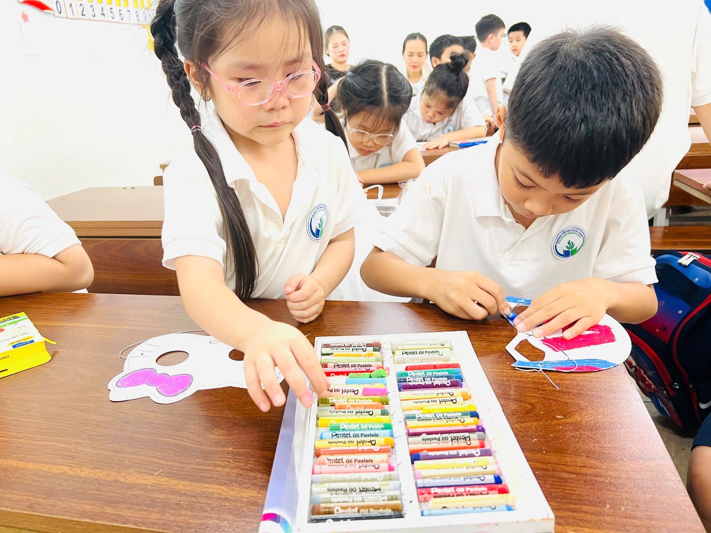 Các bạn học sinh trải nghiệm làm mặt nạ trung thu.