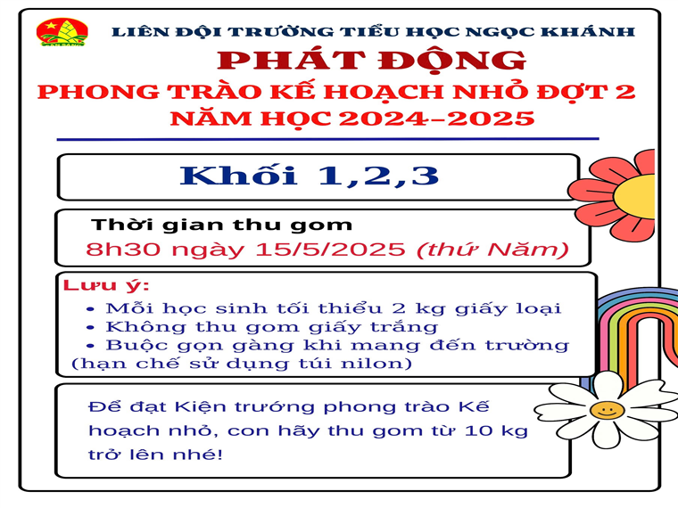 Phong trào “Kế hoạch nhỏ” là một hoạt động truyền thống mang đậm dấu ấn của Đội Thiếu niên Tiền phong Hồ Chí Minh. Đây cũng là dịp để các em học sinh thực hiện theo lời dạy của Bác Hồ kính yêu: “Tuổi nhỏ làm việc nhỏ, tùy theo sức của mình”. Với tinh thần ấy, các bạn nhỏ lớp 3A1 đã miệt mài thu gom giấy vụn, sách báo cũ không còn sử dụng nhằm đóng góp vào phong trào chung của Liên đội. Kết quả, lớp đã thu được tổng cộng 288 kg giấy vụn – một con số ấn tượng. Và xếp loại A1 trong phong trào này, thể hiện được sự nỗ lực và đồng lòng của cả tập thể.