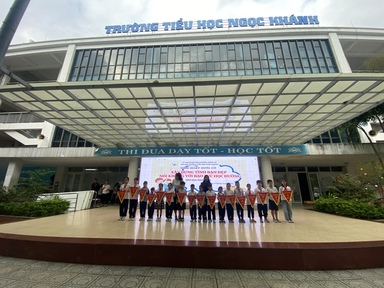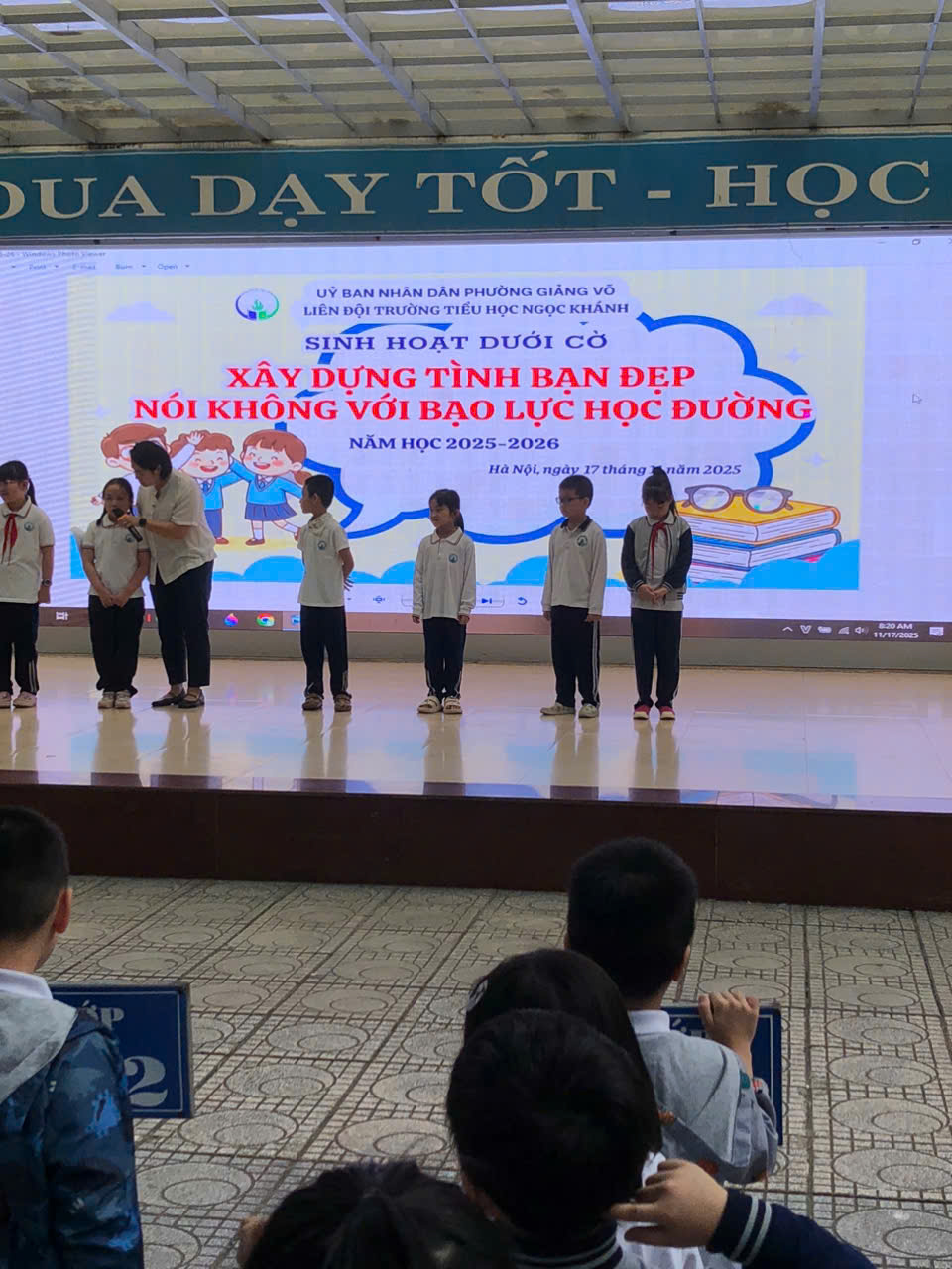 Trong buổi chào cờ hôm nay, cô Tổng phụ trách đã truyền tải đến học sinh toàn trường thông điệp “Xây dựng tình bạn đẹp, nói KHÔNG với bạo lực học đường”. Các bạn học sinh lớp 4A3 đã rất nghiêm túc lắng nghe và trả lời câu hỏi gợi mở của cô.