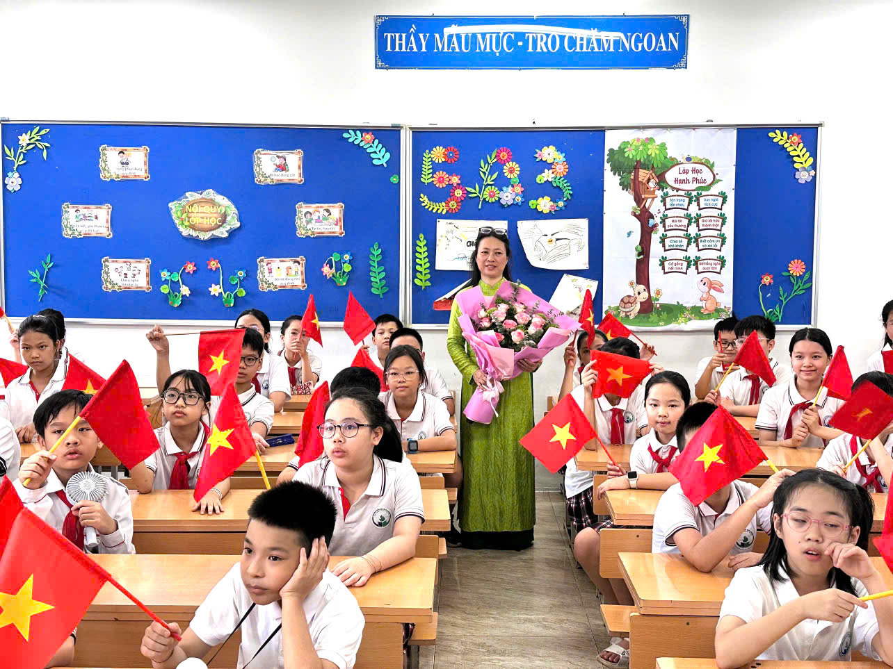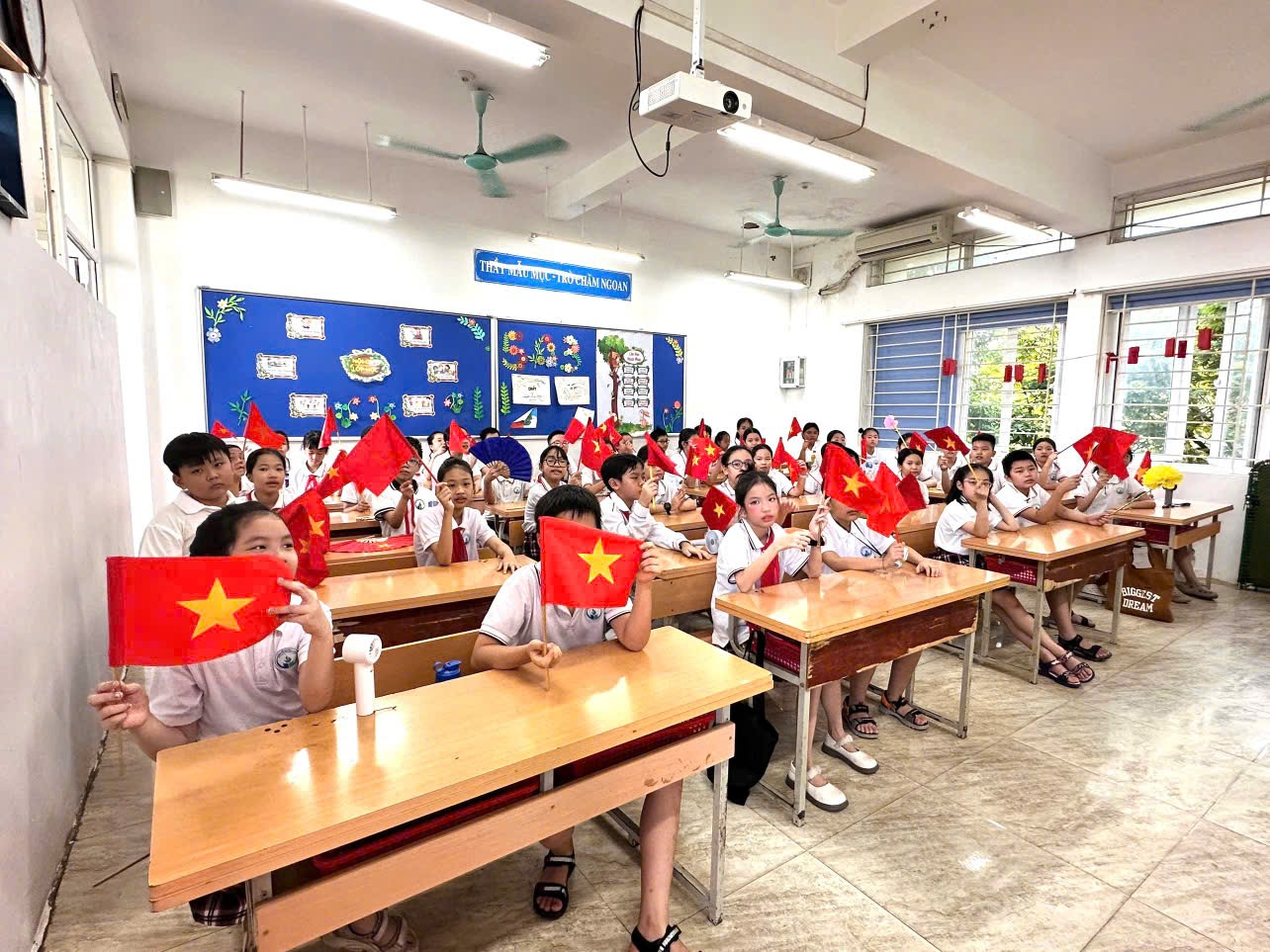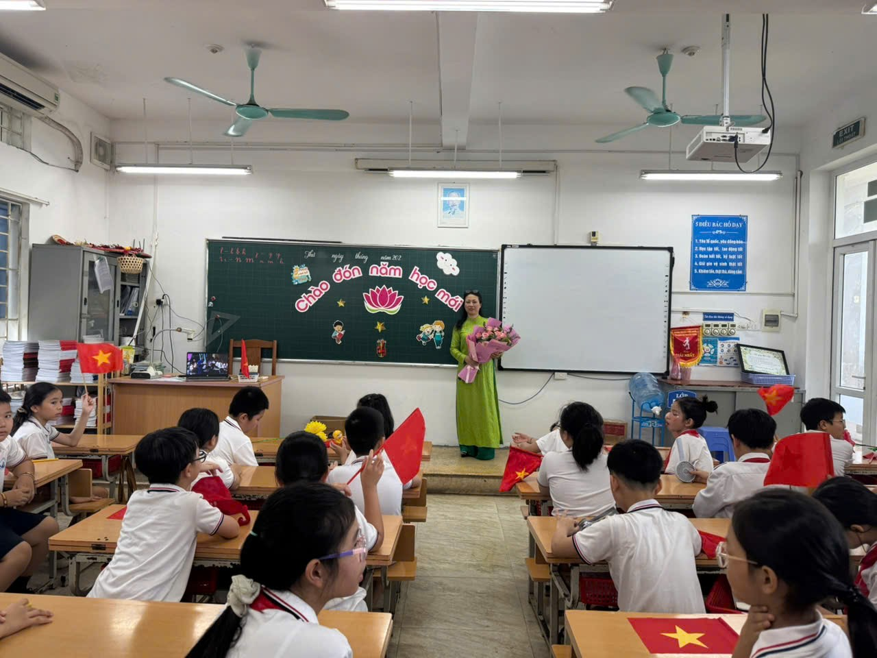 Đúng 8 giờ, tập thể lớp 5A3 cùng hòa mình vào chương trình Lễ khai giảng quốc gia. Đây là một điểm đổi mới của Bộ Giáo dục trong thời đại chuyển đổi số. Lễ chào cờ diễn ra trang nghiêm, hùng tráng, thể hiện tinh thần đoàn kết và lòng yêu nước sâu sắc của thế hệ măng non.