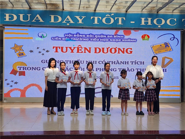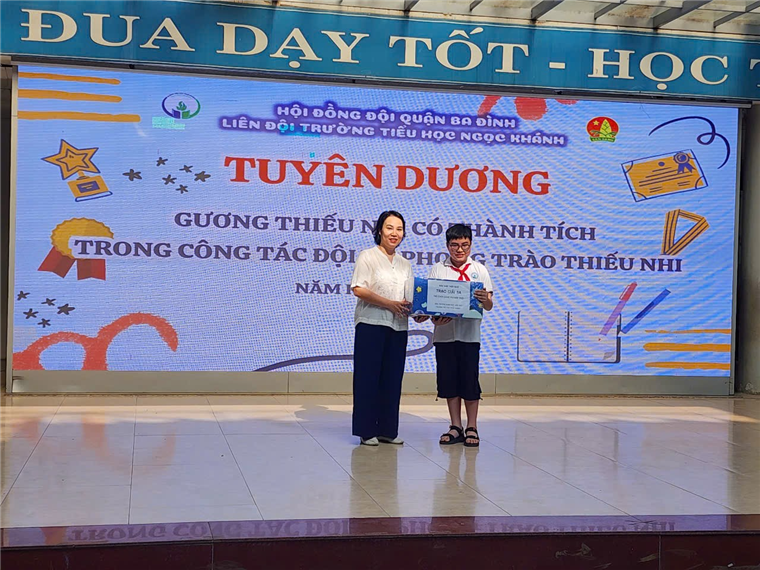 Sáng nay, ngày 5 tháng 5 năm 2025, trong buổi lễ chào cờ đầu tuần, cô Tổng phụ trách đã “Tuyên dương gương thiếu nhi có thành tích trong công tác đội và phong trào thiếu nhi năm học 2024-2025”. Trong số những gương mặt tiêu biểu của học sinh Trường Ngọc Khánh có sự góp mặt của 3 bạn học sinh lớp 5A5. Đó là bạn Mai Phương Uyên – Liên đội trưởng, bạn Đỗ Khánh Vân – Uỷ viên Liên đội của Trường TH Ngọc Khánh. Và bạn Trương Minh Đức đã đạt giải Ba cuộc thi “Trò chơi GAME vui Mặt trời” của báo Mặt Trời Nhỏ.