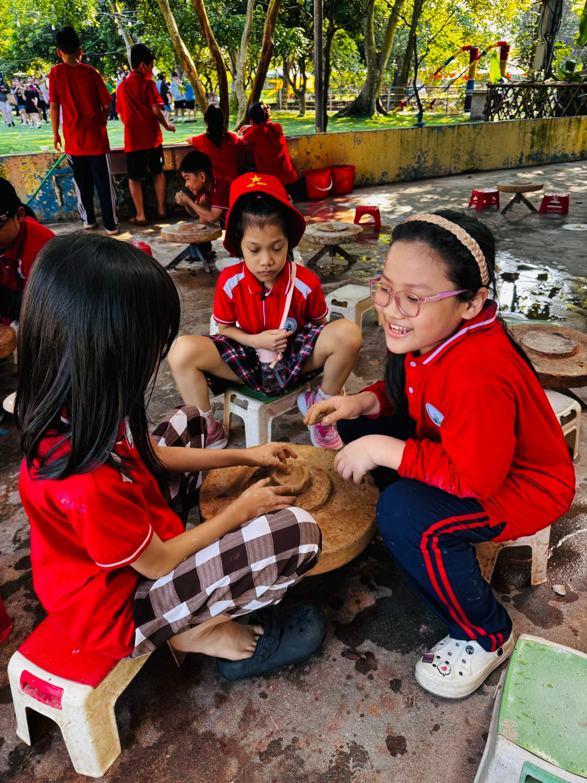 Khi đặt chân đến khu trải nghiệm, các bạn học sinh lớp 4A4 đều vô cùng háo hức. Không khí tràn ngập sự tươi vui và phấn khởi. Tại đây, các con được tham gia rất nhiều hoạt động bổ ích và lý thú. Trong khu làng nghề truyền thống, các bạn được tự tay nặn gốm, trang trí những chiếc cốc, chiếc bát theo ý thích của mình – sản phẩm tuy mộc mạc nhưng chứa đựng biết bao niềm tự hào. Tiếp đó, các con còn tham gia những trò chơi vận động thử thách, cùng nhau vượt chướng ngại vật, kéo co, rèn luyện tinh thần đồng đội và sự khéo léo.