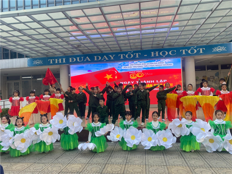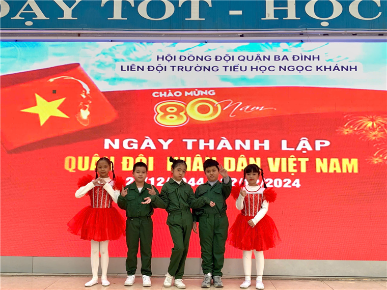 Hòa chung với không khí tưng bừng phấn khởi của cả nước hướng về kỷ niệm 80 năm ngày thành lập Quân đội nhân dân Việt Nam (22/12/1944 -22/12/2024); thực hiện nhiệm vụ năm học 2024-2025, trường Tiểu học Ngọc Khánh đã tổ chức rất nhiều hoạt động trải nghiệm giúp học sinh có thêm hiểu biết về truyền thống vẻ vang của Quân đội Nhân dân Việt Nam, bồi dưỡng lòng tự hào về những chiến công, những phẩm chất tốt đẹp của bộ đội cụ Hồ. Đồng thời, giáo dục cho học sinh lòng biết ơn đối với những người đã và đang chiến đấu bảo vệ đất nước, hòa bình cho Tổ quốc. Xen kẽ trong chương trình là các tiết mục ca múa nhạc có chủ đề ngợi ca Đảng, Bác Hồ, chiến công vẻ vang của QĐND Việt Nam anh hùng, tình yêu quê hương đất nước, con người Việt Nam do các em học sinh khối 3- Trường Tiểu học Ngọc Khánh biểu diễn. Qua đó, càng làm cho chương trình thêm phần long trọng, hào hùng.