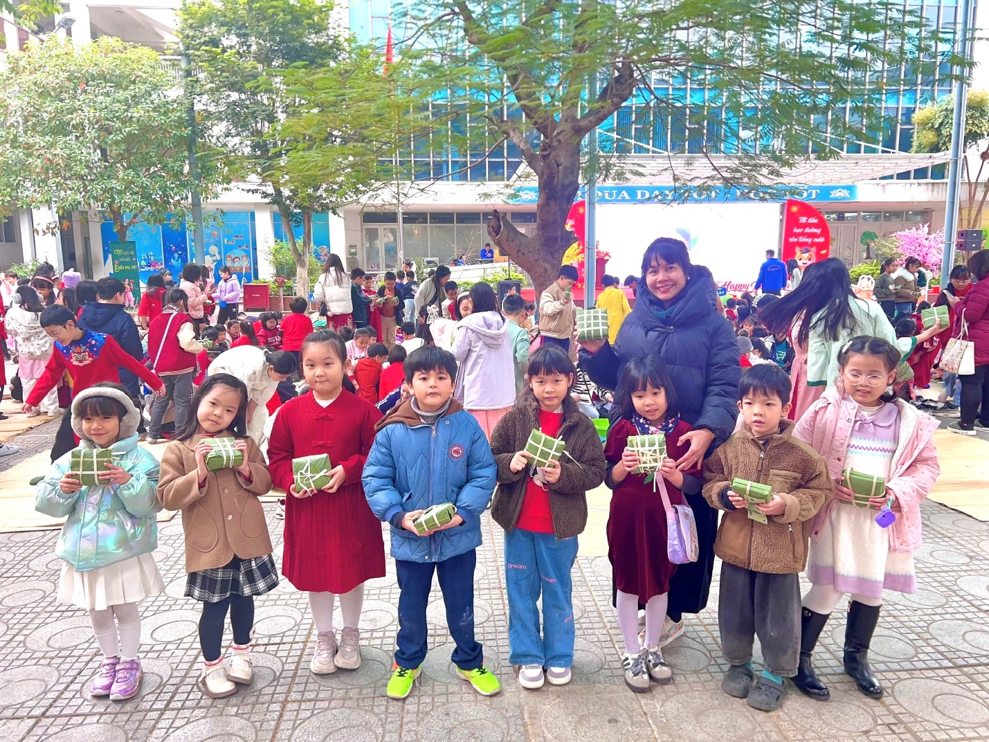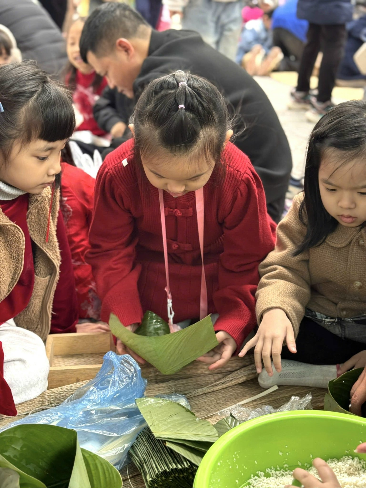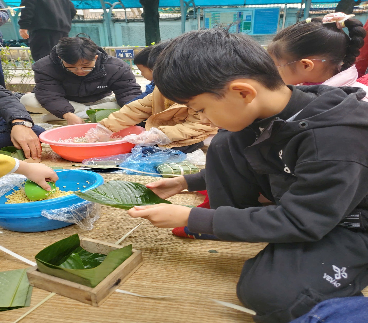 Các em được trực tiếp trải nghiệm gói bánh chưng, tìm hiểu nét đẹp Tết cổ truyền Việt Nam dưới sự hướng dẫn của thầy cô và phụ huynh.