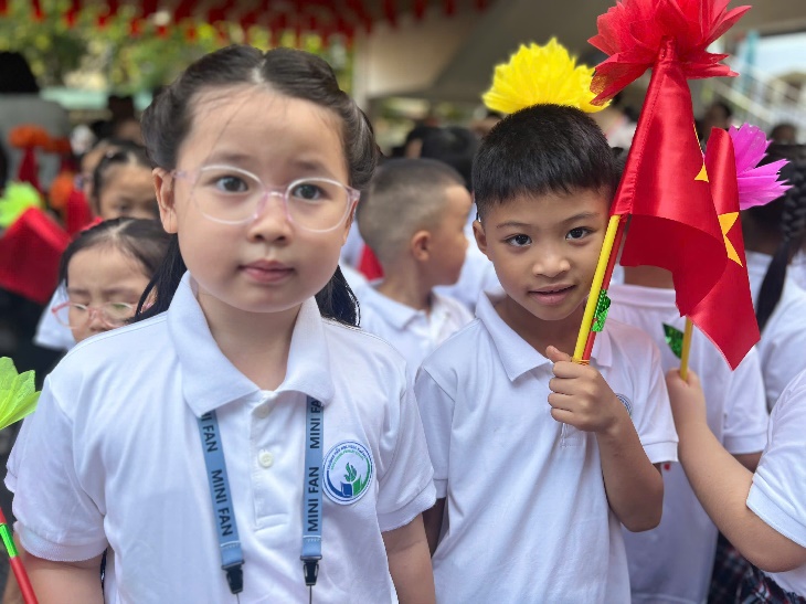 Các bạn nhỏ lớp 1a5 tay cầm cờ hoa, háo hức đón ngày khai giảng.