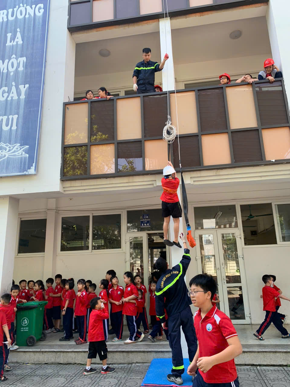 ⁃ Khối 5 thực hành leo dây thoát hiểm từ tầng cao.
