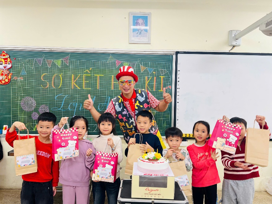 Buổi sơ kết cuối năm của lớp 1A5 được tổ chức trong không khí vui tươi. Các bạn lớp 1A5 được xem một buổi biểu diễn hoạt náo cùng chú hề, tham gia chơi đố vui và vặn bóng.