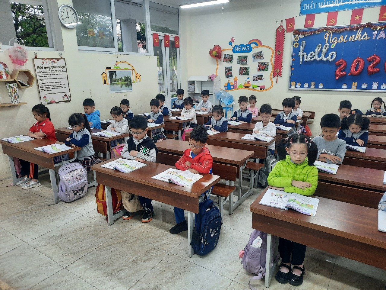 Vào đầu giờ mỗi sáng trong ngày, mỗi khi tiếng trống trường vang lên, các bạn nhỏ lớp 1A6 liền nhanh chân bước vào lớp để bắt đầu giờ truy bài. Như đã hình thành nếp truy bài từ đầu năm học, khi anh chị sao đỏ trực tuần bước vào lớp, sau tiếng bắt nhịp của bạn quản ca là tiếng hát trong trẻo của các bạn nhỏ lớp 1A6 vang lên trong niềm phấn khởi để bắt đầu một ngày học mới đầy năng lượng. Tiếp đó, cả lớp đồng thanh ôn lại bài đọc mà các con đã được học ngày hôm qua.