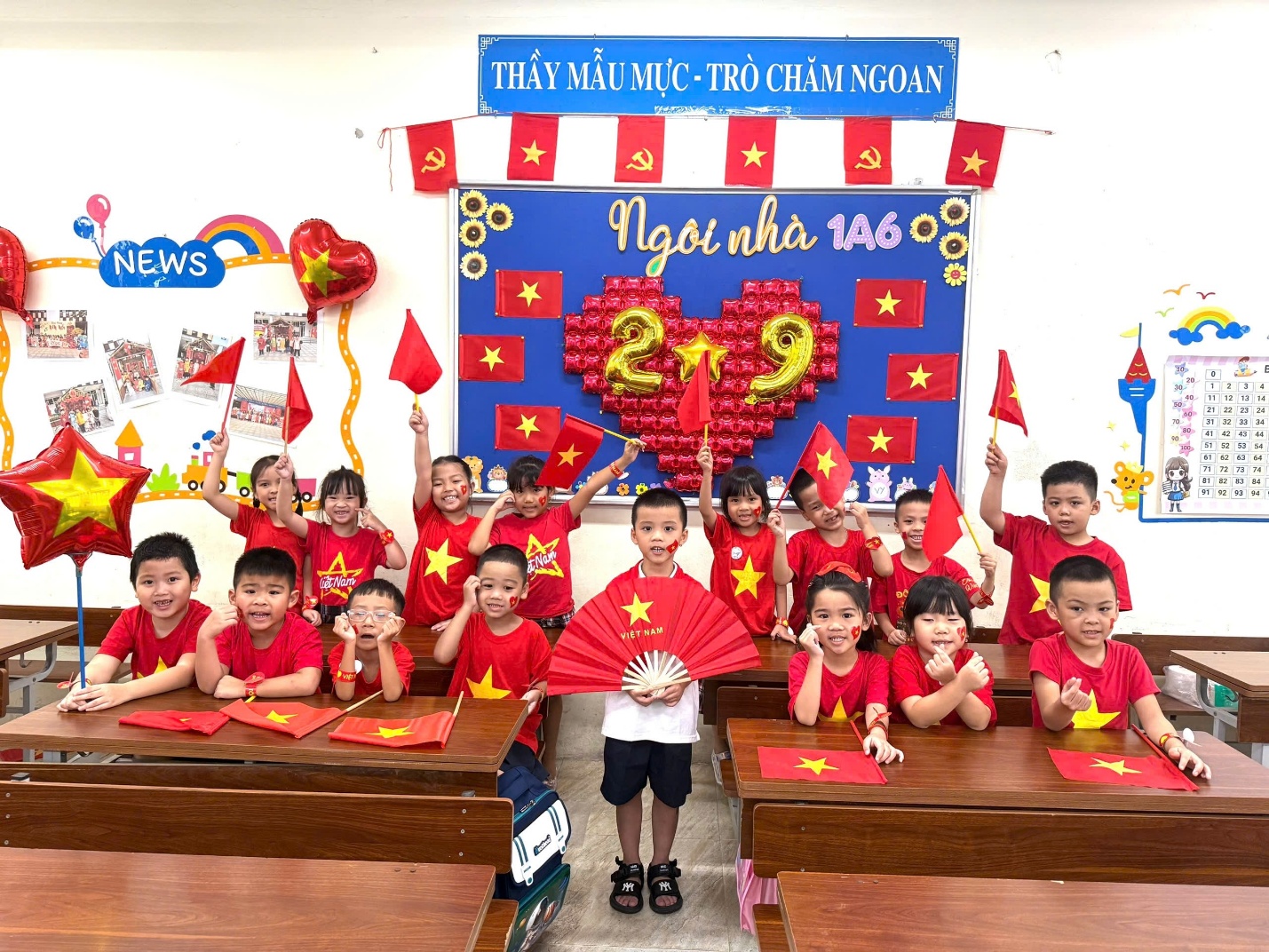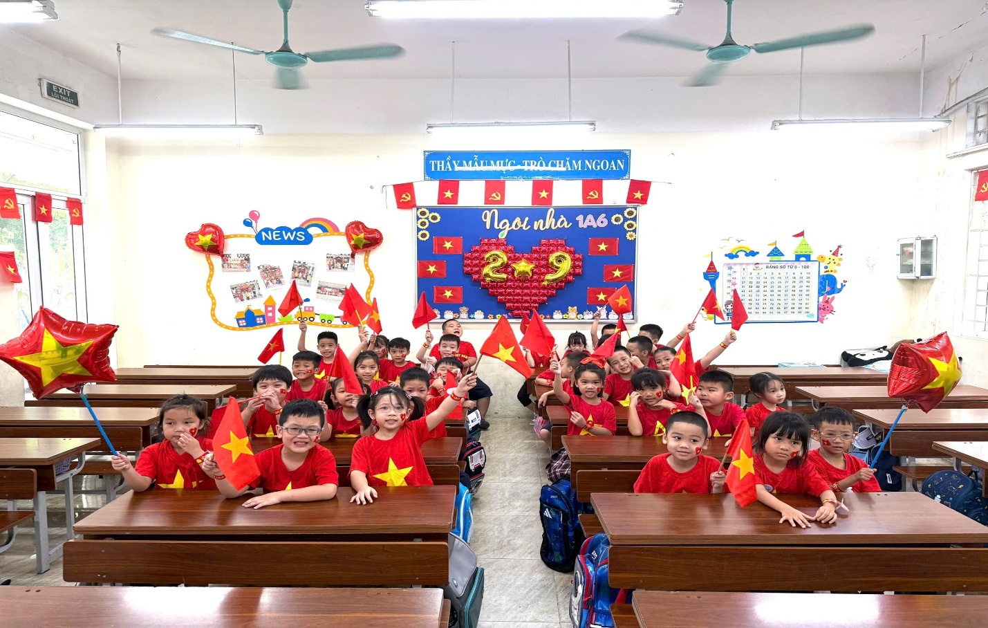 Ngay từ những ngày đầu tháng Tám, lớp đã rộn ràng với phong trào trang trí lớp học. Không gian lớp học được phủ lên sắc đỏ tươi thắm của cờ Tổ quốc, điểm xuyết những ngôi sao vàng lấp lánh, tạo nên một bầu không khí phấn khởi, tự hào. Hình ảnh các bạn nhỏ trong màu áo đỏ sao vàng, tay cầm lá cờ Tổ quốc tung bay rực rỡ đã để lại nhiều cảm xúc đẹp, lan tỏa tinh thần yêu nước và niềm tự hào dân tộc. Những hoạt động ấy không chỉ giúp lớp học thêm sinh động, mà còn là dịp để các bạn học sinh ôn lại truyền thống lịch sử vẻ vang của dân tộc, bồi dưỡng tình yêu quê hương đất nước và quyết tâm học tập, rèn luyện thật tốt để mai sau góp phần xây dựng Tổ quốc giàu mạnh, văn minh.