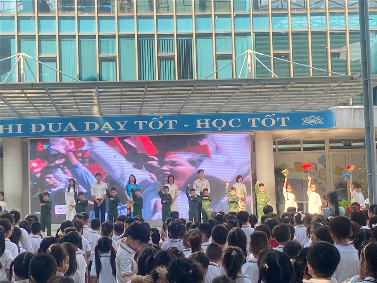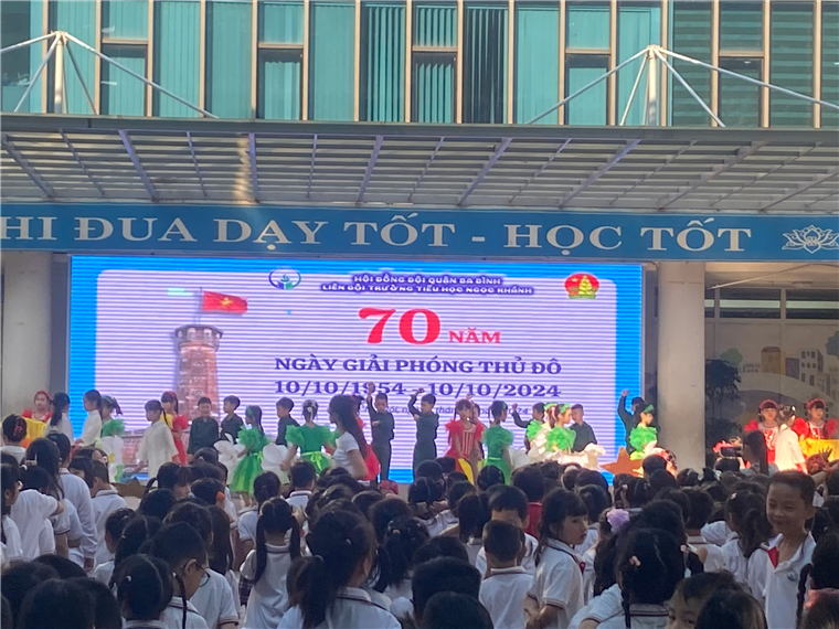 Cũng trong tiết chào cờ đầu tuần, học sinh toàn trường đã được xem những thước phim tư liệu về ngày Giải phóng Thủ đô để giúp các con hiểu về truyền thống lịch sử của đất nước ta. Sau bài tuyên truyền của cô Tổng phụ trách là tiết mục văn nghệ của phụ huynh và học sinh khối lớp 2. Các bạn nhỏ trong màn múa hát với trang phục bộ đội, áo dài truyền thống và những bộ váy áo xinh đẹp rực rỡ đã thể hiện xuất sắc tiết mục văn nghệ, đem đến nhiều cảm xúc cho thầy cô và các bạn.
