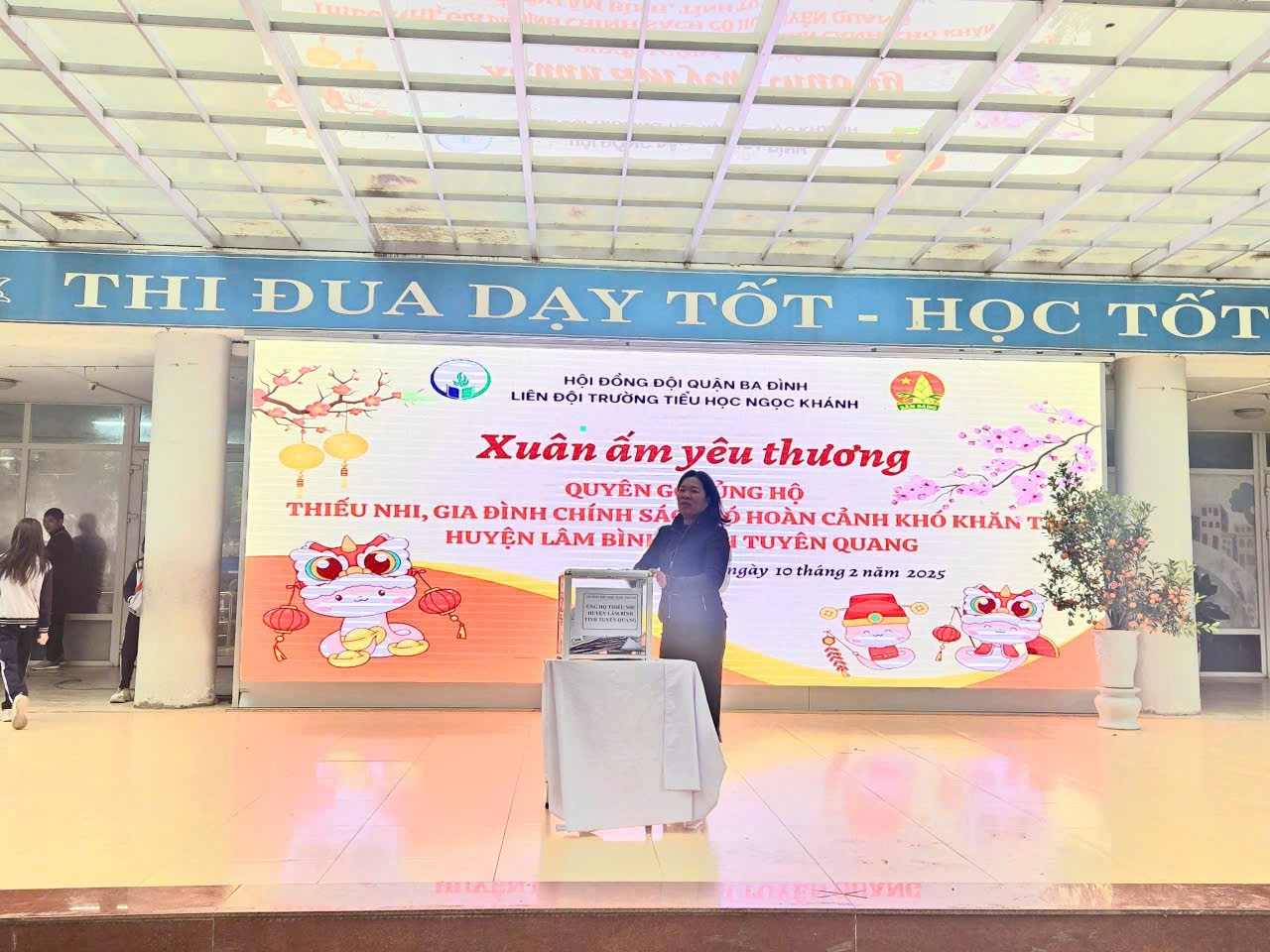Sáng ngày 10/02/2025, thực hiện Chương trình công tác Đội và phong trào thiếu nhi năm học 2024 – 2025, Đoàn Thanh niên phối hợp với Phòng Giáo dục và Đào tạo tổ chức hoạt động “Xuân ấm yêu thương” để ủng hộ thiếu nhi, gia đình chính sách có hoàn cảnh khó khăn tại huyện Lâm Bình, tỉnh Tuyên Quang. Tập thể giáo viên và học sinh lớp 3A5 của Liên đội trường Tiểu học Ngọc Khánh tích cực quyên góp ủng hộ với tinh thần “Tương thân, tương ái”; “Lá lành đùm lá rách”. Tổng số tiền quyên góp được là 2.200.000 đồng.