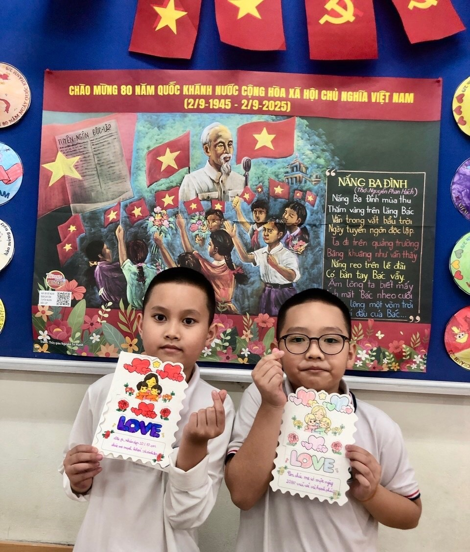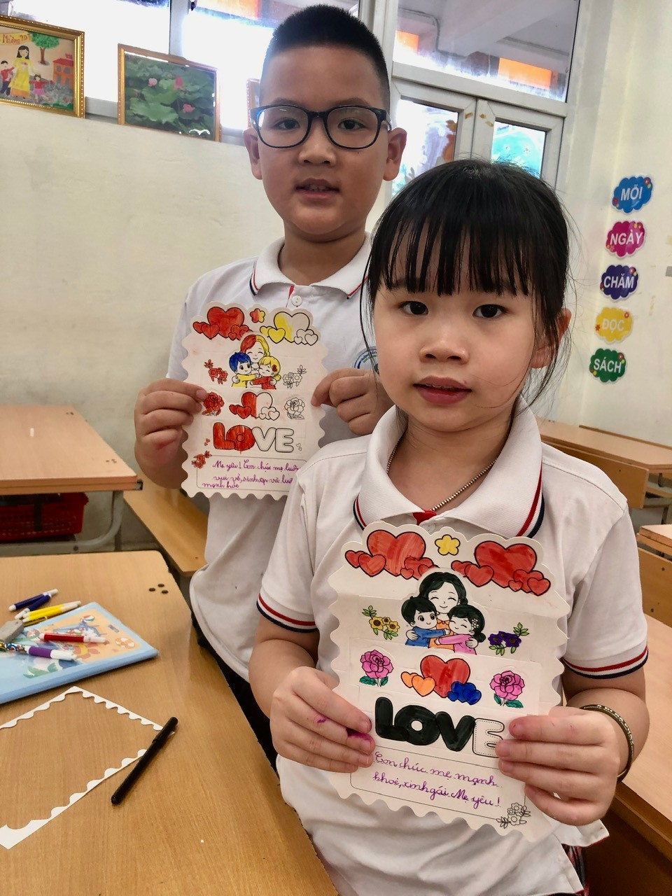 Với chủ đề “Yêu thương gửi tặng mẹ và cô”, dưới sự hướng dẫn tận tình của giáo viên chủ nhiệm những tấm thiệp xinh xắn được tạo nên từ đôi bàn tay bé nhỏ đã mang theo những lời chúc ngọt ngào, chân thành gửi tới mẹ và cô giáo.