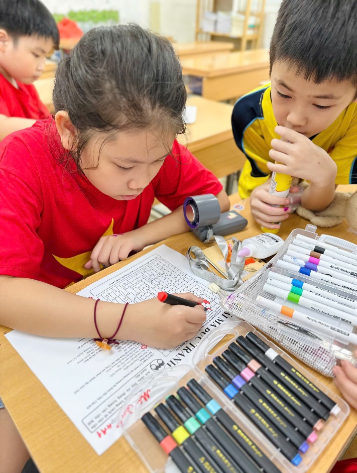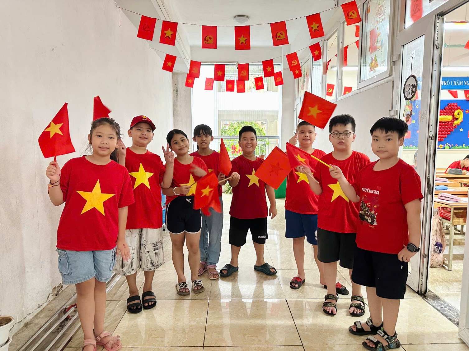 Ngay từ những ngày đầu tháng Tám, lớp đã rộn ràng với phong trào trang trí lớp học. Góc học tập, bảng tin và không gian lớp đều được phủ lên sắc đỏ tươi thắm của cờ Tổ quốc, điểm xuyết những ngôi sao vàng lấp lánh, tạo nên một bầu không khí thiêng liêng, tự hào.