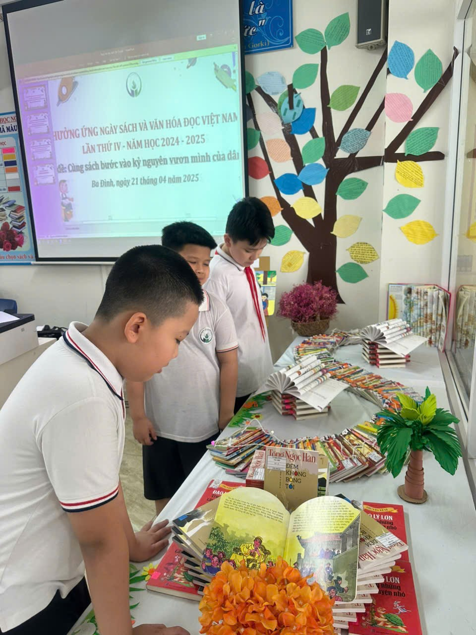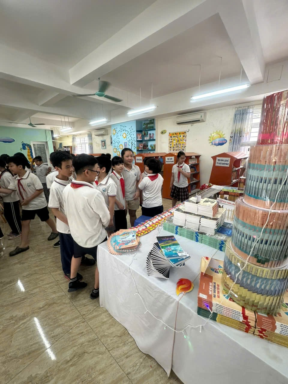 Thư viện trưng bày nhiều sách hay quá, chúng mình ngắm mãi mà không chán!