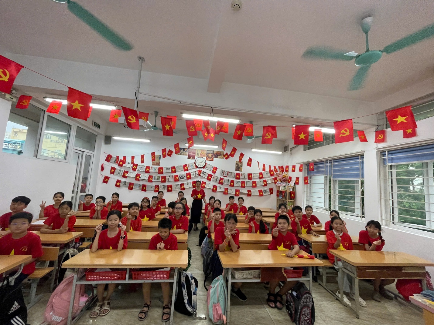 Cả lớp ngập tràn sắc đỏ cờ Tổ quốc và ngôi sao vàng kiêu hãnh.