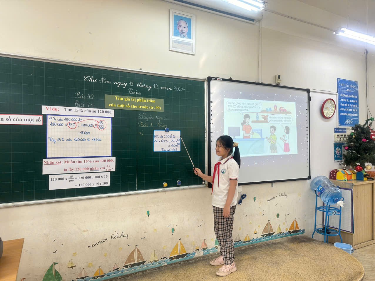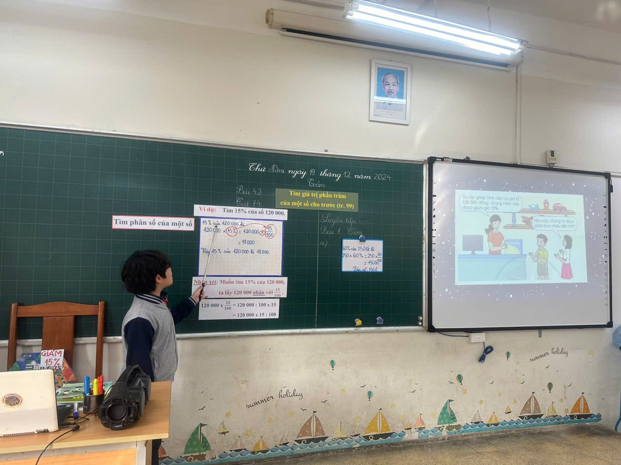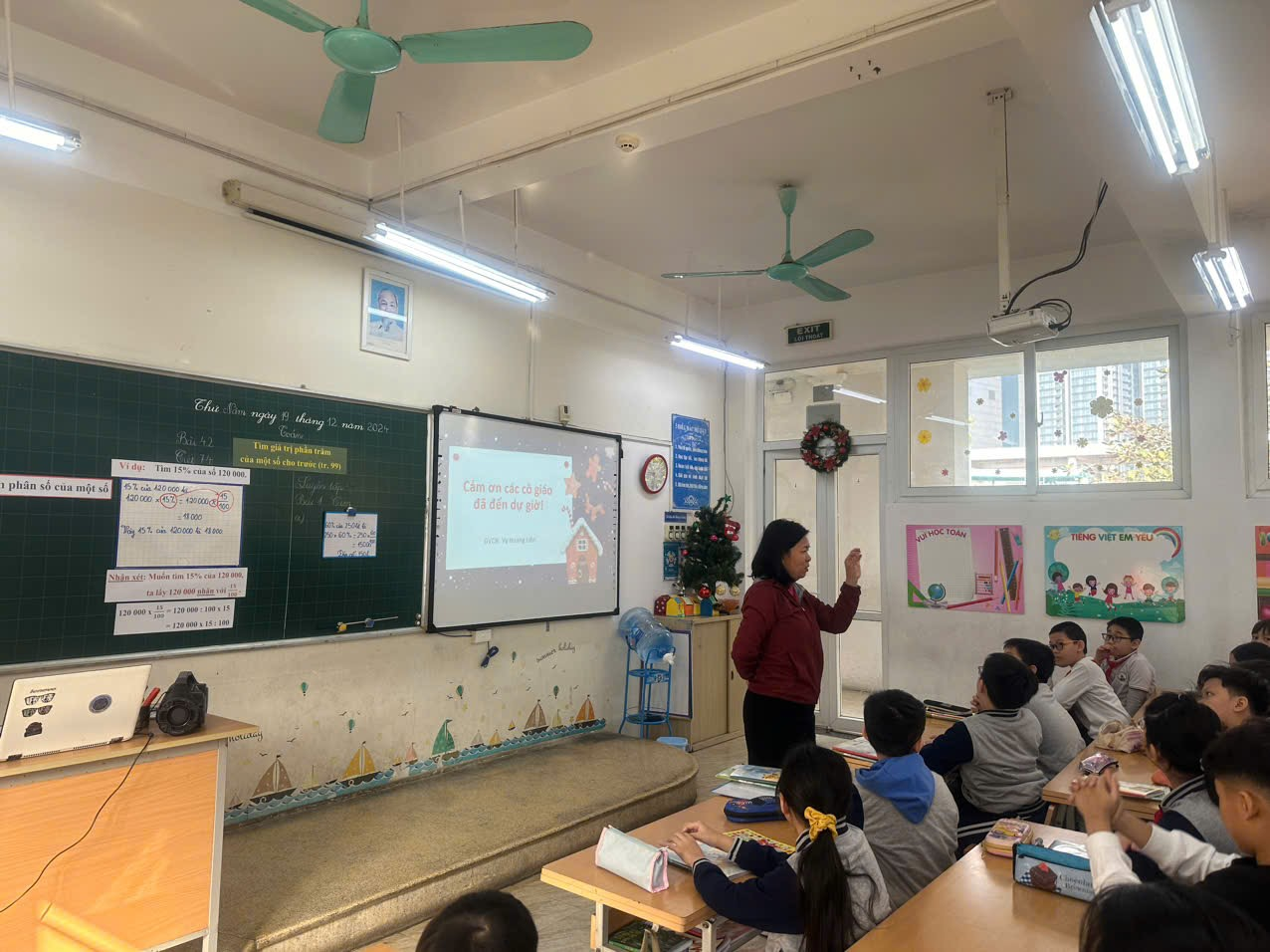 Hôm nay (Thứ Năm ngày 19 – 12 – 2024), các con học bài 42 – tiết 74: “Tìm giá trị phần trăm của một số cho trước”. Nhờ sự dẫn dắt khéo léo của cô giáo chủ nhiệm, các con lớp 5A1 đã tích cực khám phá kiến thức mới, biết phát hiện tìm tòi, biết vận dụng bài cũ để giải bài mới. Nhiều bạn trả lời to, rõ ràng, hợp tác nhóm tốt, làm bài nhanh và đúng, liên hệ thực tế linh hoạt. Tiết dạy được Ban giám hiệu nhận xét và đánh giá tốt, có tinh thần đổi mới, phù hợp với chương trình và sách giáo khoa. Đây là động lực để cô – trò lớp 5A1 dạy & học tốt hơn nữa.