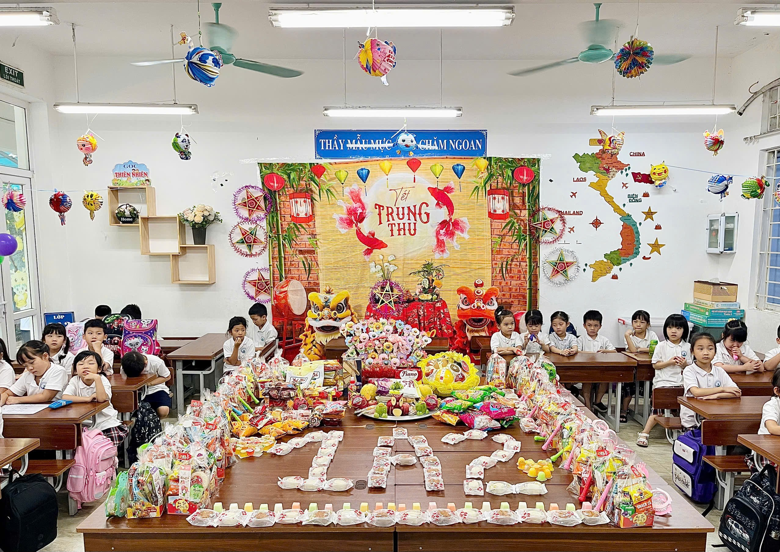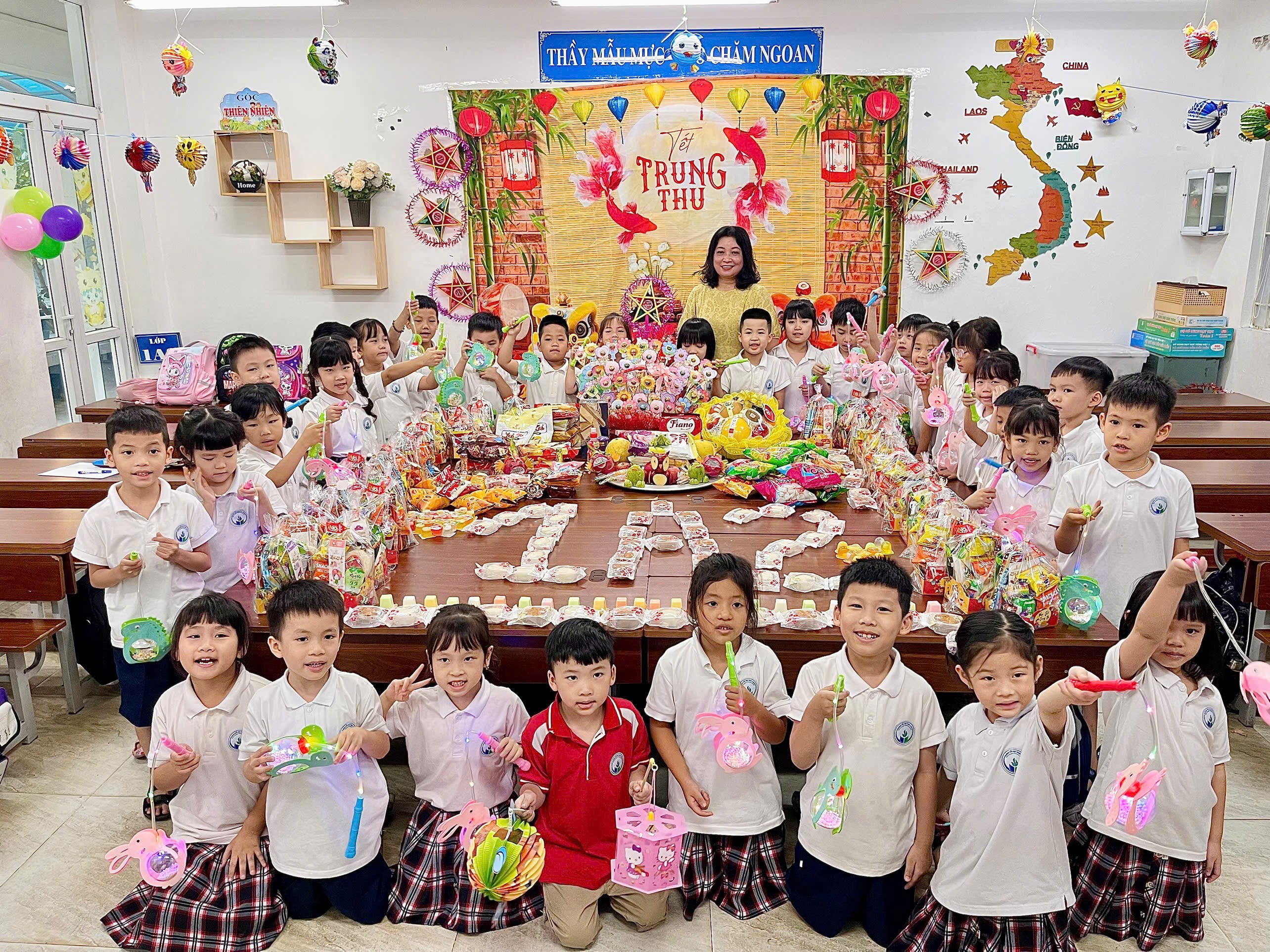 Trong không khí nhộp nhịp toàn trường, các con học sinh lớp 1A2 đã được cùng cô giáo chủ nhiệm và các bậc phụ huynh tham gia chuẩn bị hoa quả, bánh kẹo, sắp xếp mâm cỗ. Các con còn được cô giáo và bố mẹ hướng dẫn bày mâm cỗ mang hơi ấm của Tết trung thu cổ truyền. Ngày Tết trung thu thật vui và mang ý nghĩa với tất cả các em học sinh. Sau đây là một số hình ảnh "Vui trung thu" của các con lớp 1A2.