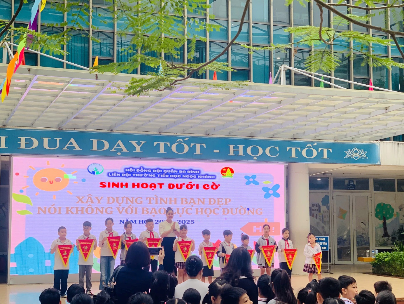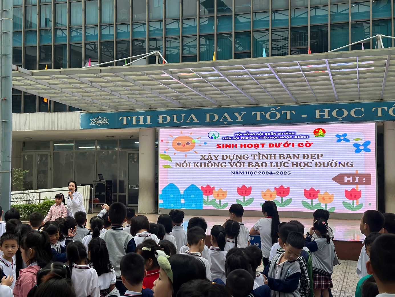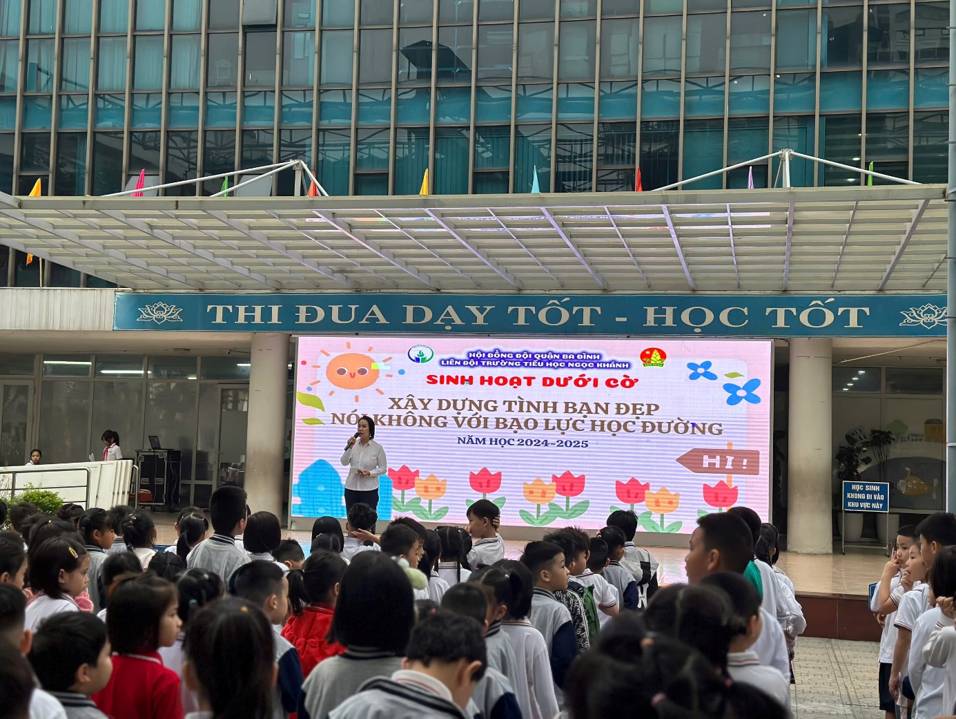 Trường học là một môi trường không những cung cấp cho chúng ta những kiến thức về khoa học, mà còn là nơi rèn luyện nhân cách đạo đức cho học sinh, mang đến cho các em một tâm hồn đẹp và trang bị cho các em một quan niệm đúng đắn về cuộc sống. Thế nhưng một điều nhức nhối đang diễn ra trong nhà trường, đó chính là nạn “Bạo lực học đường”. Vì vậy trong tiết sinh hoạt dưới cờ thứ hai ngày 25/11/2024 Trường Tiểu học Ngọc Khánh đã tổ chức buổi sinh hoạt đầu tuần với chủ đề: “Xây dựng tình bạn đẹp – Nói không với bạo lực học đường”.