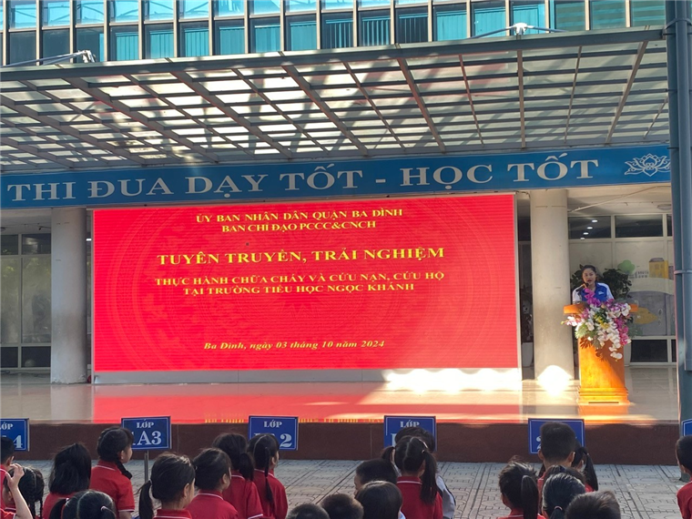 Nhằm tăng cường công tác tuyên truyền, phổ biến kiến thức, kỹ năng về phòng cháy, chữa cháy và cứu nạn, cứu hộ (PCCC và CNCH), huy động sức mạnh tổng hợp của các tầng lớp nhân dân tham gia công tác PCCC và CNCH, ngay trong sáng nay (ngày 03/10/2024, tại Trường tiểu học Ngọc Khánh, Phòng Cảnh sát PCCC và CNCH Công an quận Ba Đình đã phối hợp với Trường tiểu học Ngọc Khánh tổ chức tuyên truyền về công tác PCCC, CNCH cho cán bộ, giáo viên, nhân viên và học sinh Trường tiểu học Ngọc Khánh.