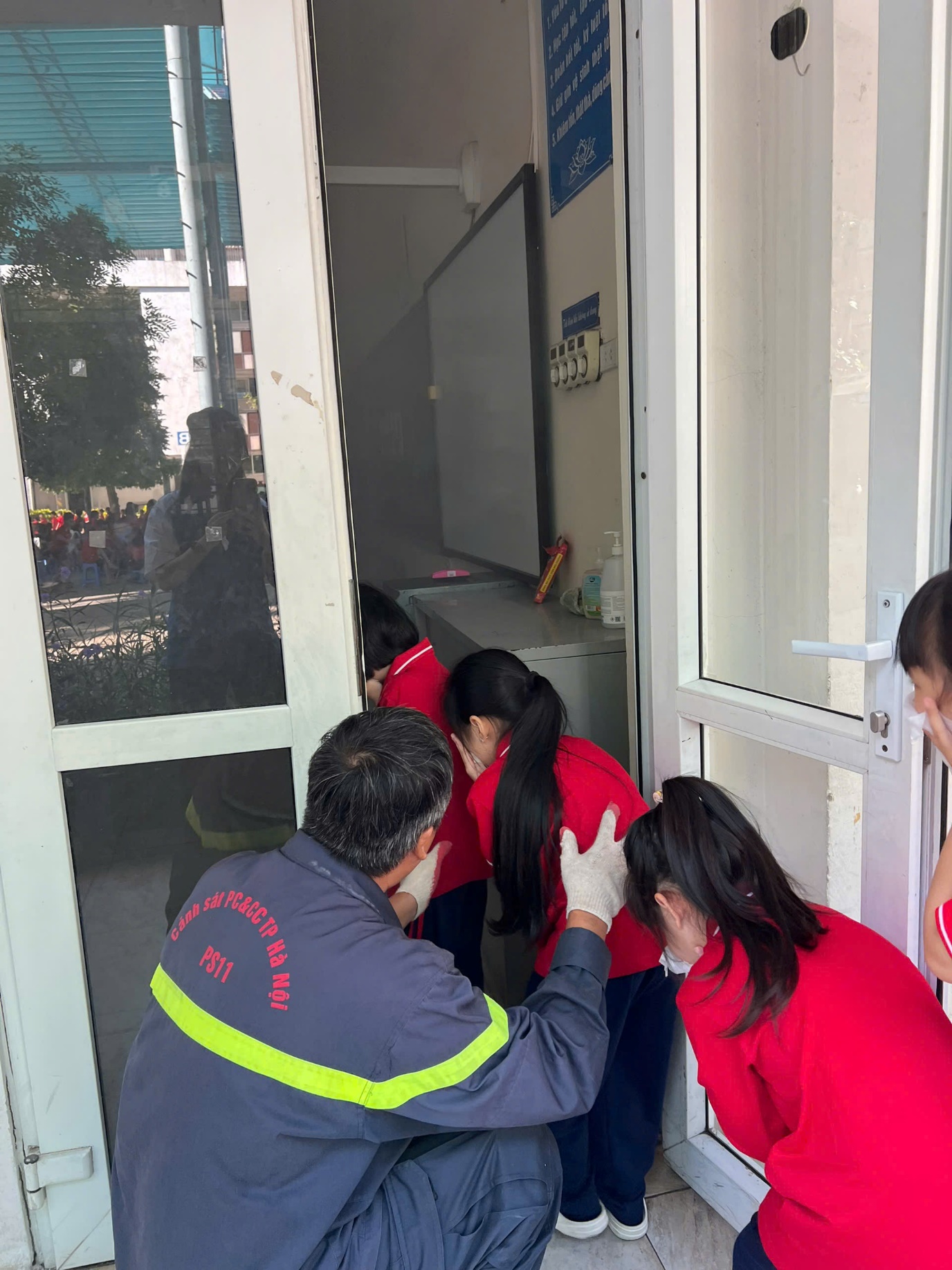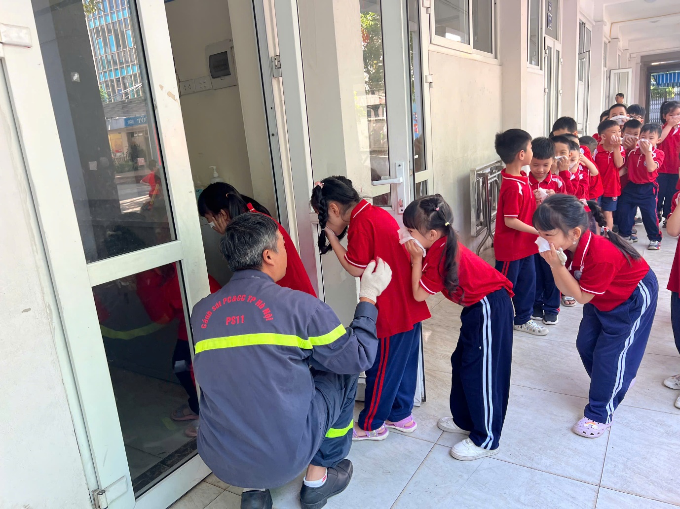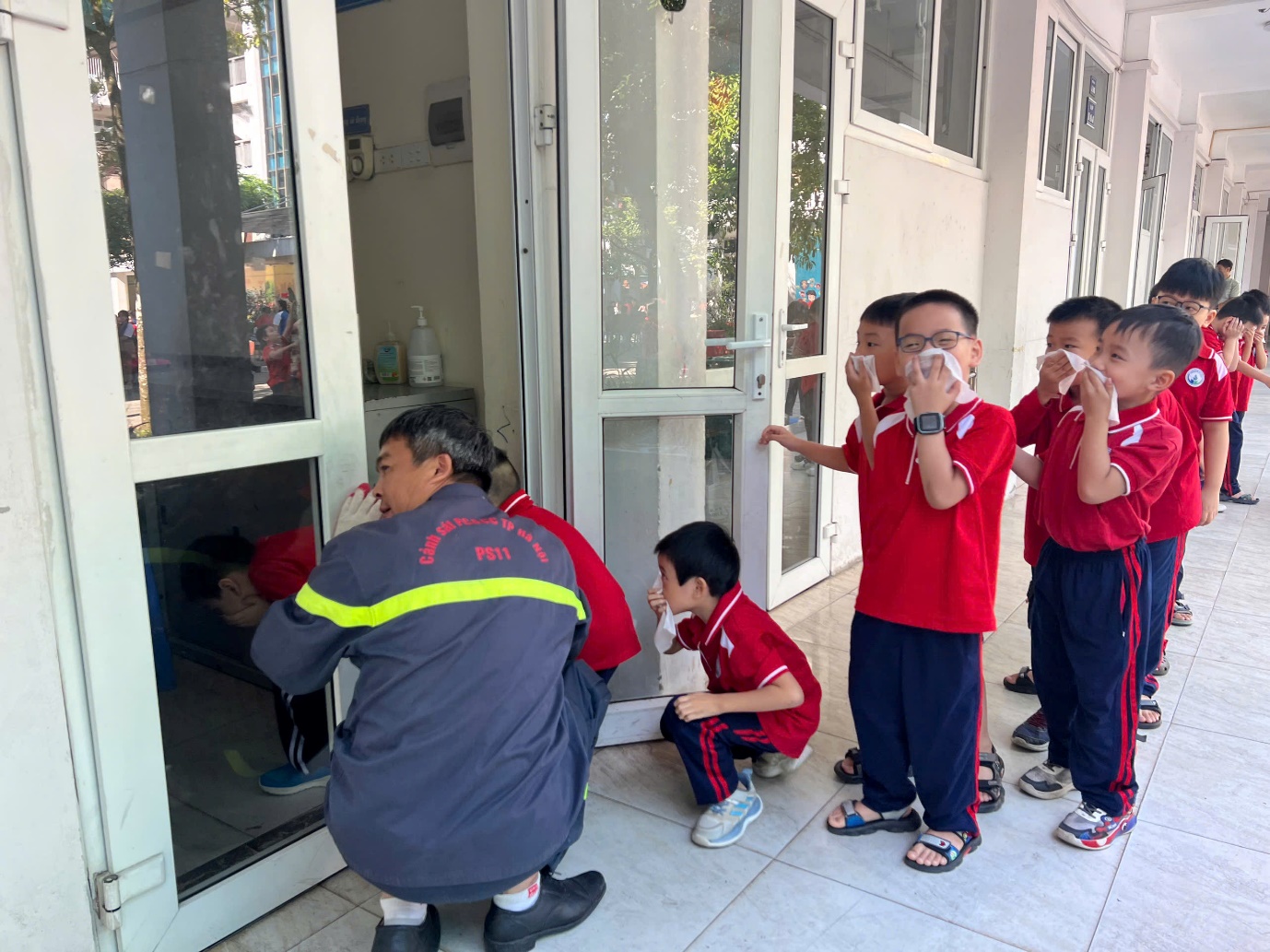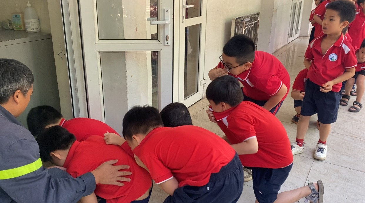 Các anh chị lớp trê, thì tập huấn thoát hiểm từ tầng cao, học cách dập lửa phòng hỏa hoạn. Còn các em bé lớp 1,2 được tập huấn thoát hiểm khỏi vùng bị cháy.