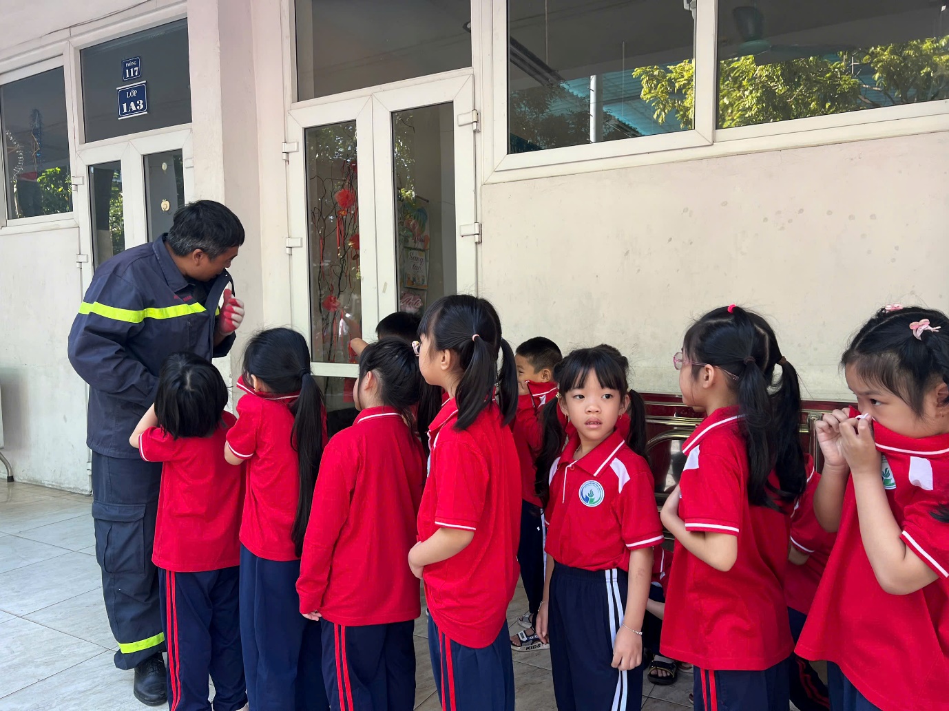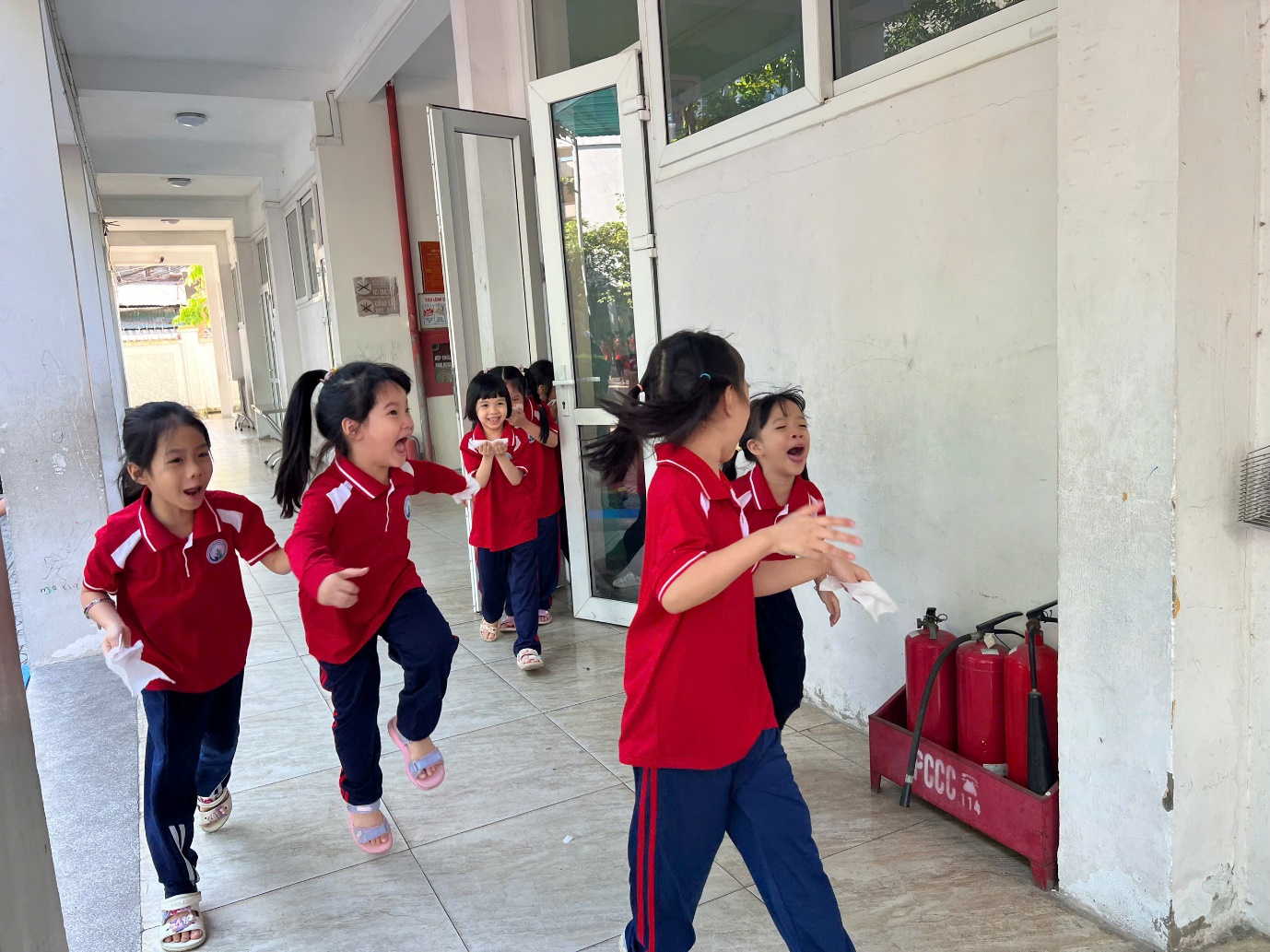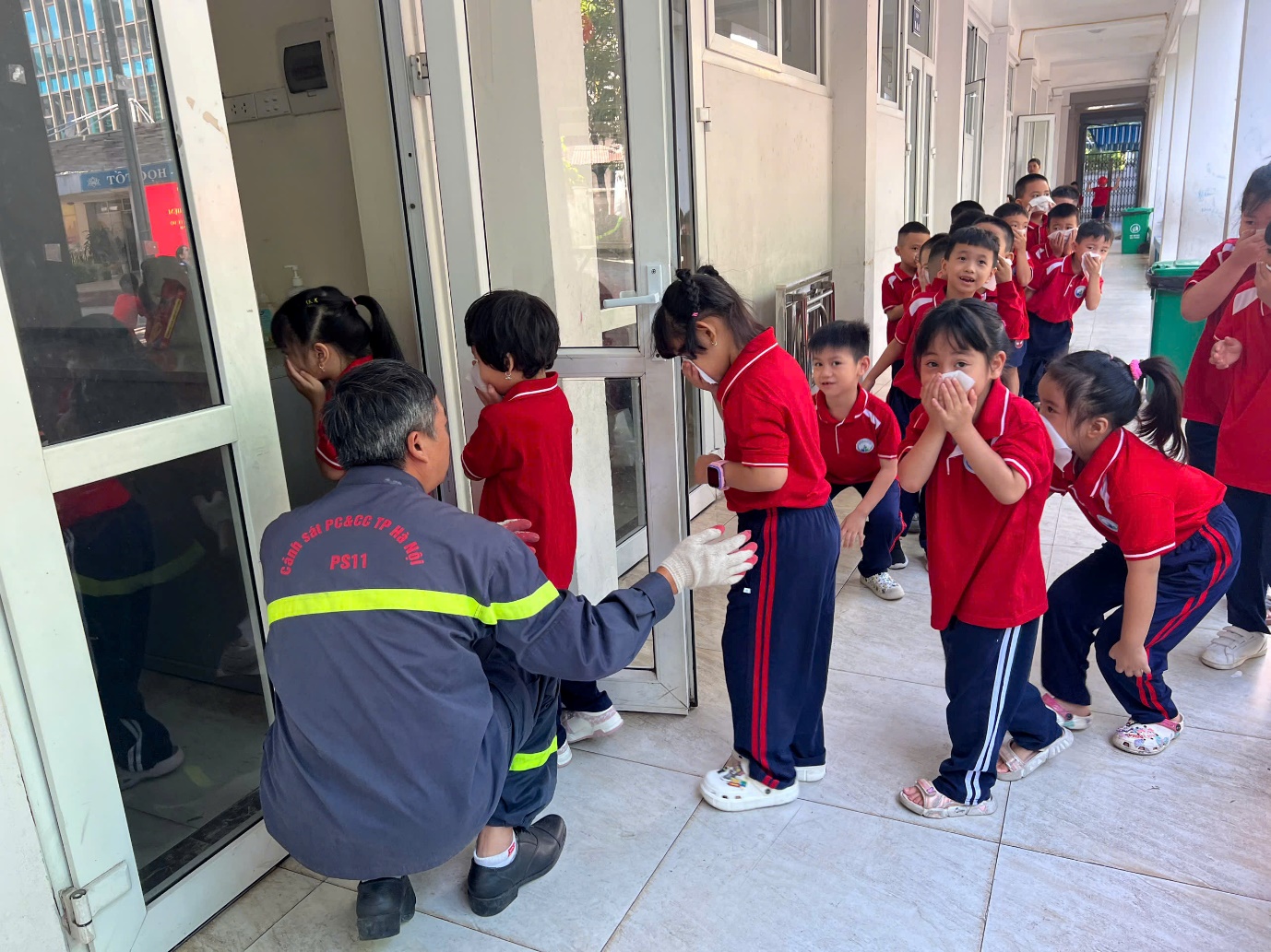 Các anh chị lớp trê, thì tập huấn thoát hiểm từ tầng cao, học cách dập lửa phòng hỏa hoạn. Còn các em bé lớp 1,2 được tập huấn thoát hiểm khỏi vùng bị cháy.