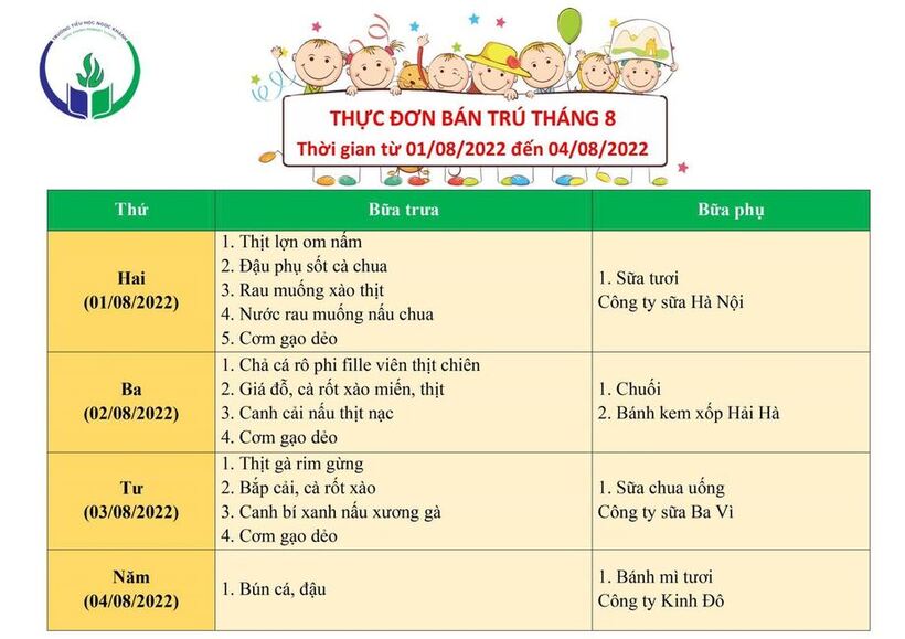 Trường TH Ngọc Khánh thông báo tới cha mẹ và các em học sinh thực đơn bán trú từ ngày 01/08 – 04/08/2022.