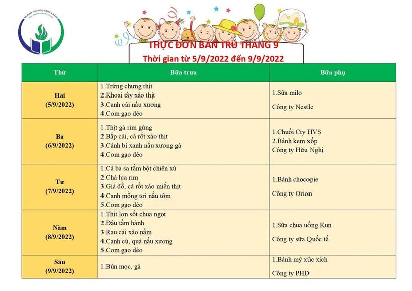 Thực đơn bán trú (Áp dụng từ ngày 05/09 - 09/09/2022)