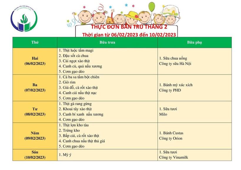 Thực đơn bán trú (Áp dụng từ ngày 06/02 - 10/02/2023)