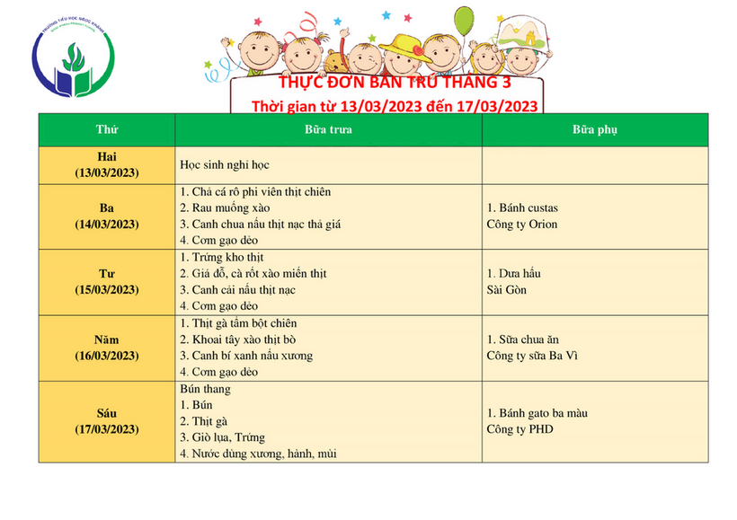 Trường TH Ngọc Khánh thông báo tới cha mẹ và các em học sinh thực đơn bán trú từ ngày 14/03 – 17/03/2023. Lưu ý: Thực đơn có thể thay đổi tùy theo tình hình thực tế nhưng không làm giảm hàm lượng dinh dưỡng.