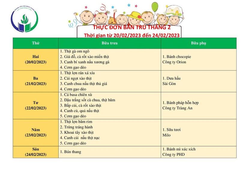 Thực đơn bán trú (Áp dụng từ ngày 20/02 - 24/02/2023)