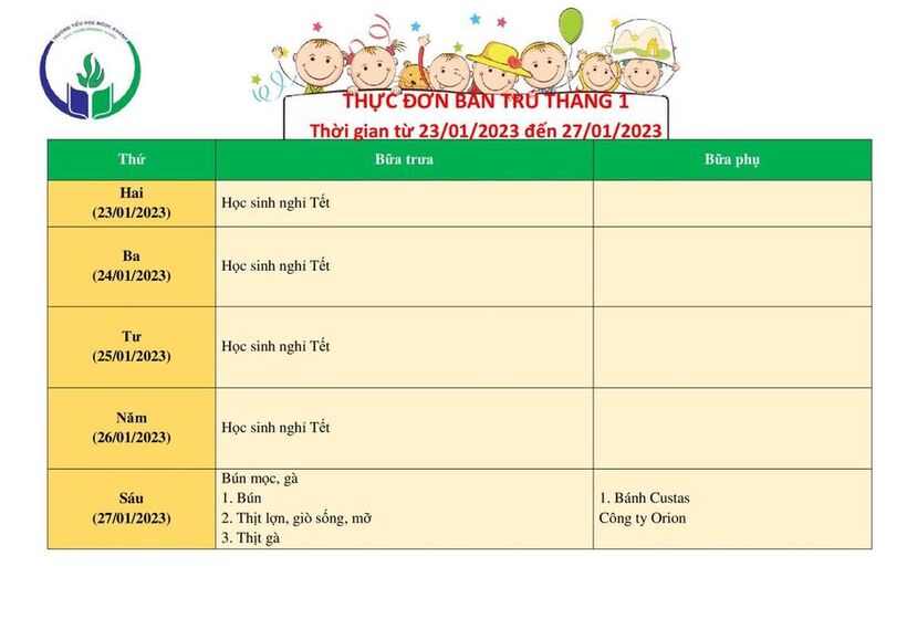 Thực đơn bán trú (Áp dụng từ ngày 23/01 – 27/01/2023)