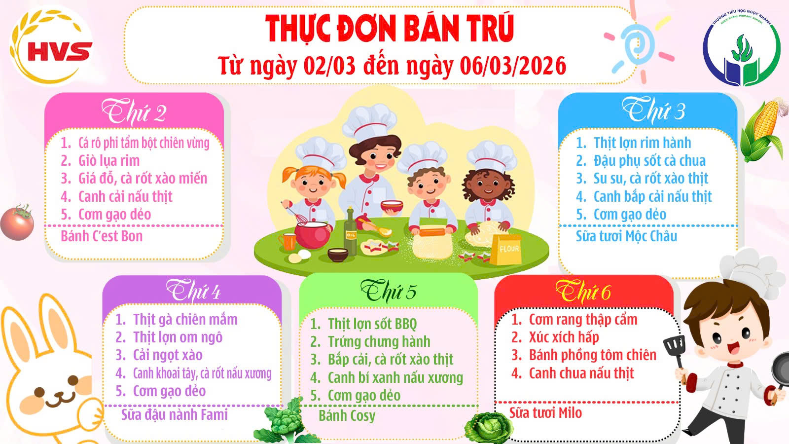 Trường TH Ngọc Khánh thông báo tới cha mẹ và các em học sinh thực đơn bán trú từ ngày 02/03/2026 - 06/03/2026.