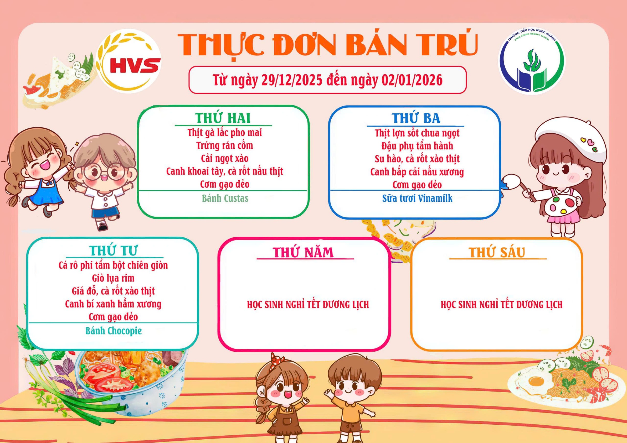 Trường TH Ngọc Khánh thông báo tới cha mẹ và các em học sinh thực đơn bán trú từ ngày 29/12/2025 - 02/01/2026.