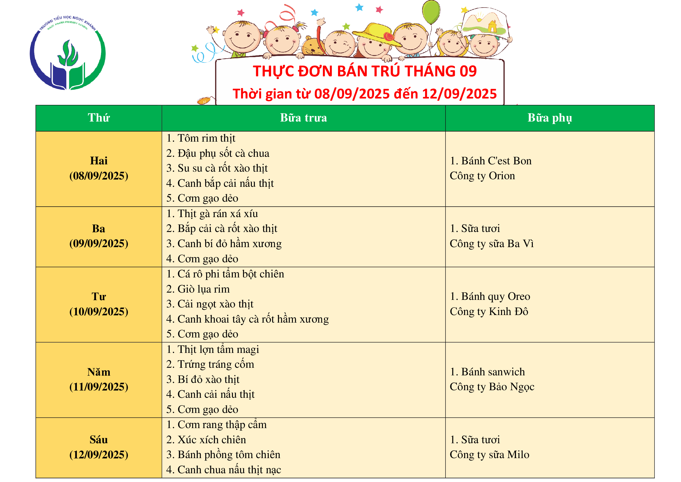 Trường TH Ngọc Khánh thông báo tới cha mẹ và các em học sinh thực đơn bán trú từ ngày 8/9/2025 - 12/9/2025.