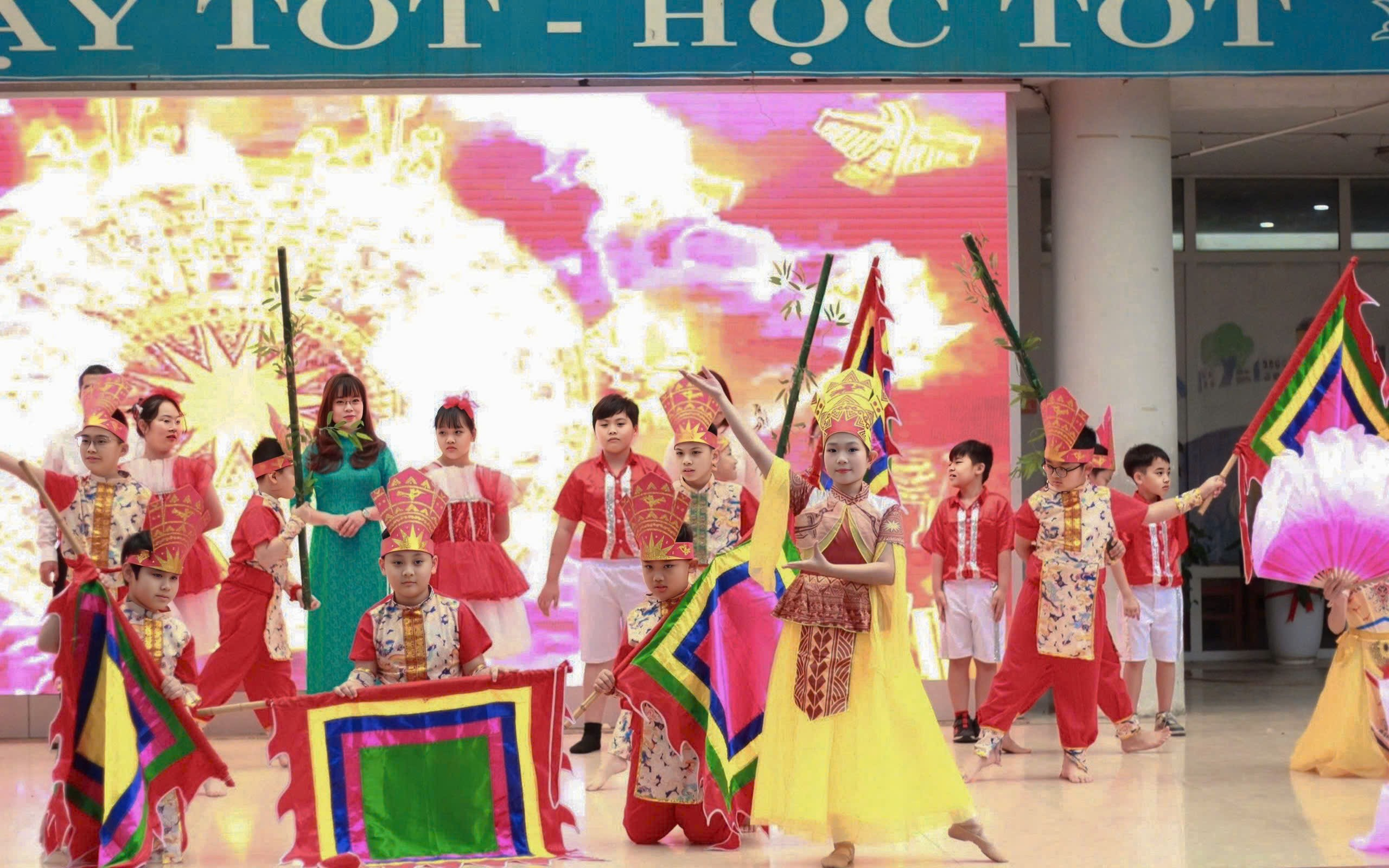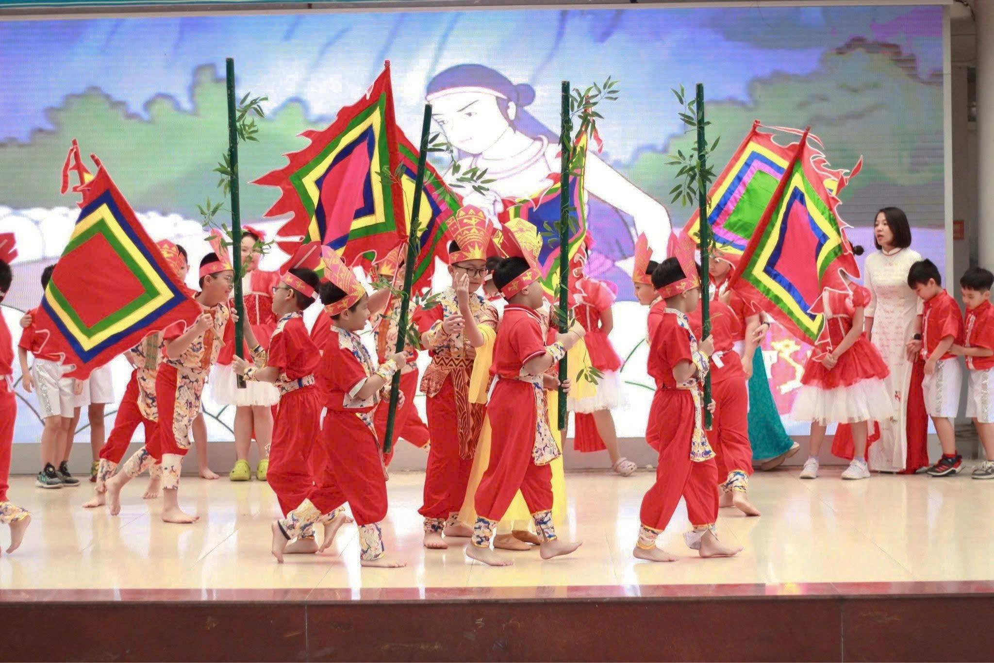 Khi giai điệu hùng tráng của bài hát vang lên, tái hiện những trang sử hào hùng của dân tộc. Những bước chân nhịp nhàng, những cánh tay vươn mạnh mẽ và sắc màu rực rỡ của trang phục đã khiến sân khấu như bừng sáng. Hình ảnh phụ huynh và các con hòa mình vào từng nhịp nhạc, cùng kể lại câu chuyện dựng nước của cha ông, đã mang đến một tiết mục vừa công phu, vừa lay động lòng người.