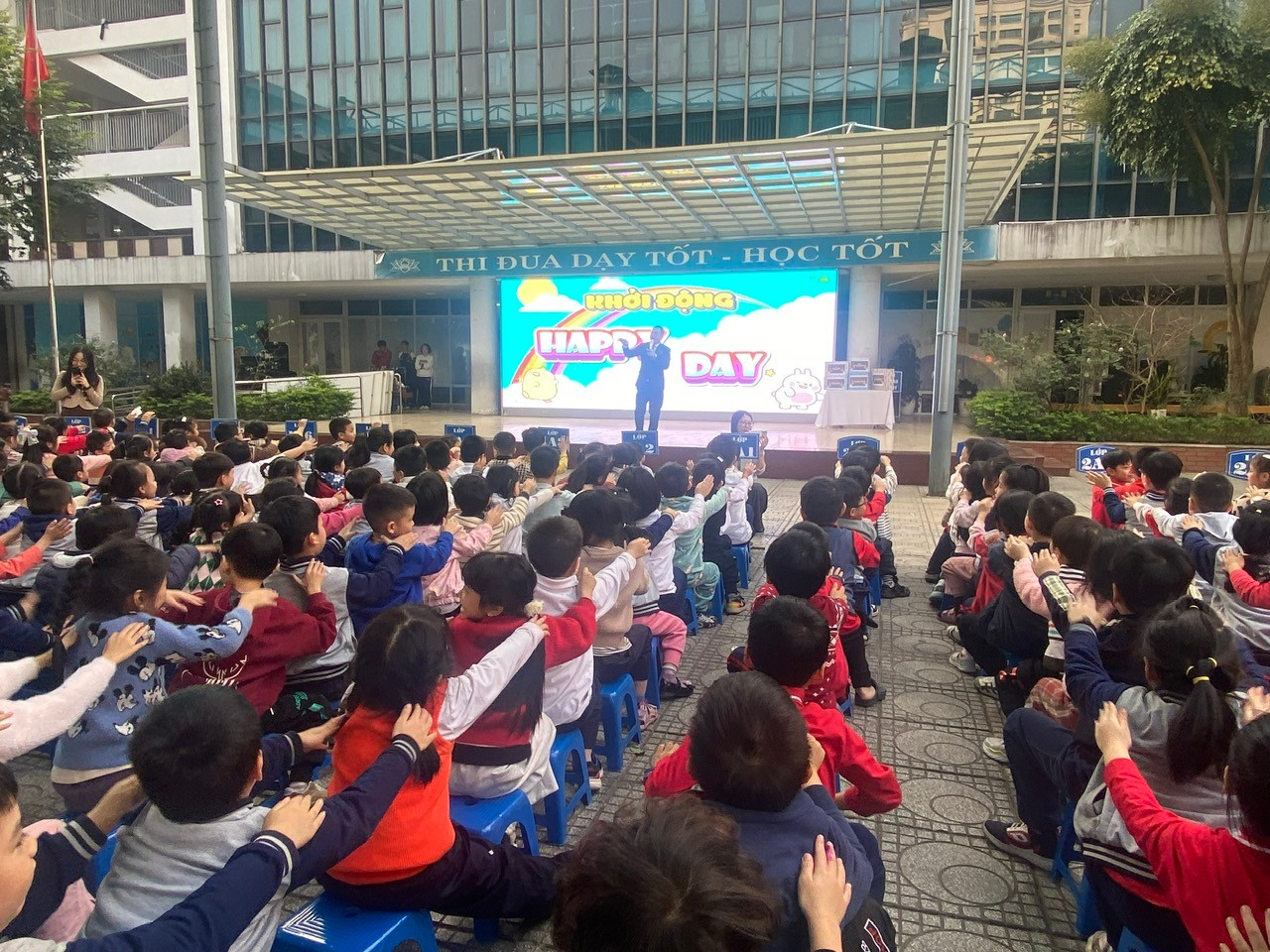 Hình ảnh những cánh tay kết thành hình trái tim yêu thương dưới sân trường chính là minh chứng cho sự đồng lòng của thầy và trò nhà trường trong việc xây dựng một "Trường học hạnh phúc" đúng nghĩa.
