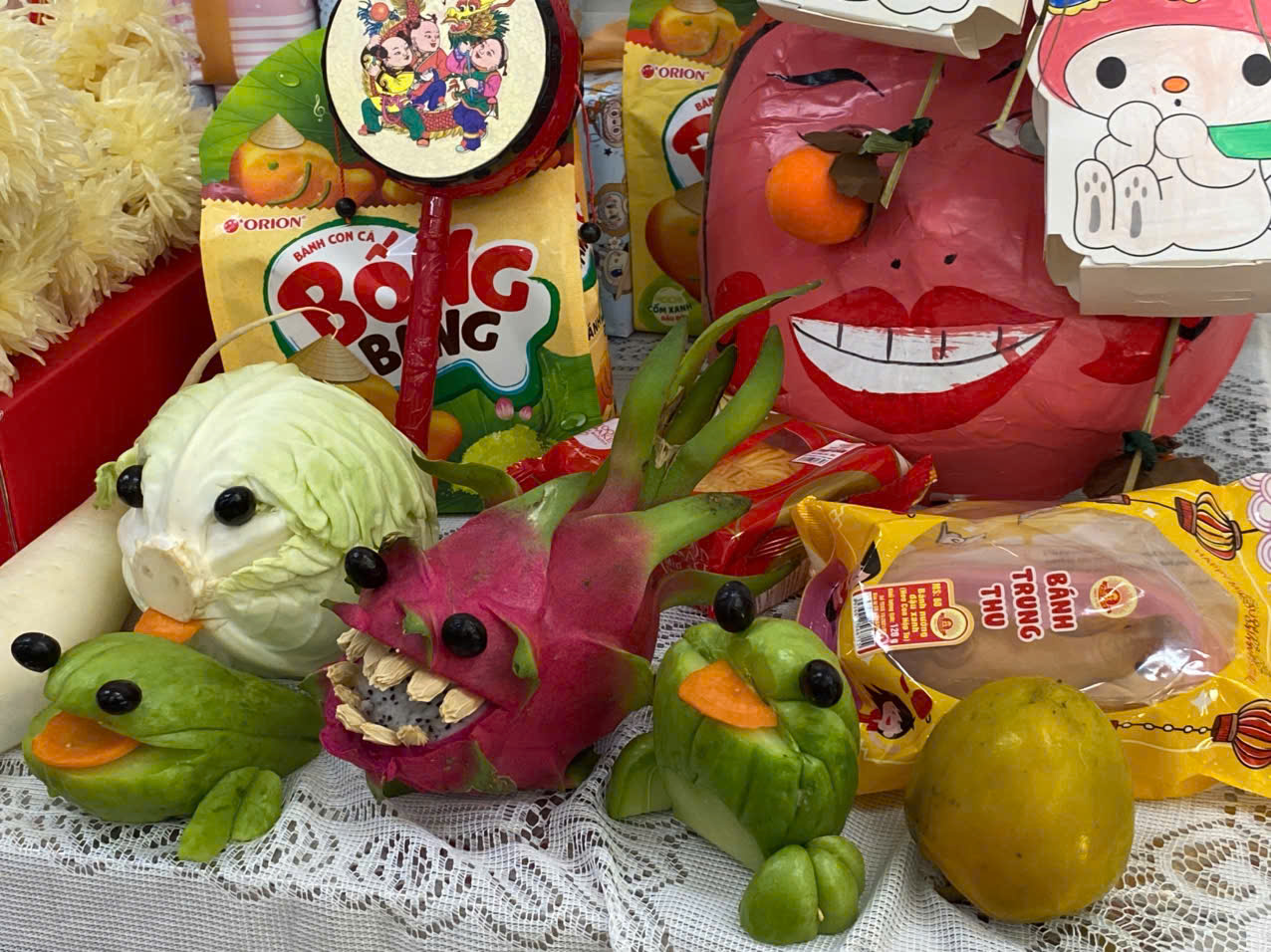 Trên bàn giữa lớp, cô giáo cùng các bạn bày biện một mâm cỗ Trung thu thật đẹp mắt. Mâm cỗ có đầy đủ hoa quả như bưởi, chuối, táo, na và đặc biệt là bánh trung thu ngọt ngào. Ngoài ra còn có rất nhiều kẹo đủ màu, được xếp thành hình ngôi sao sáng rực.