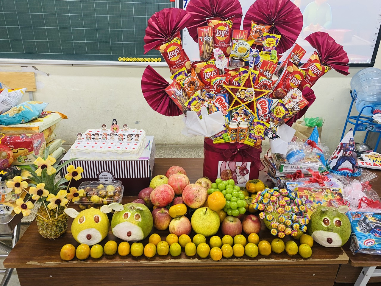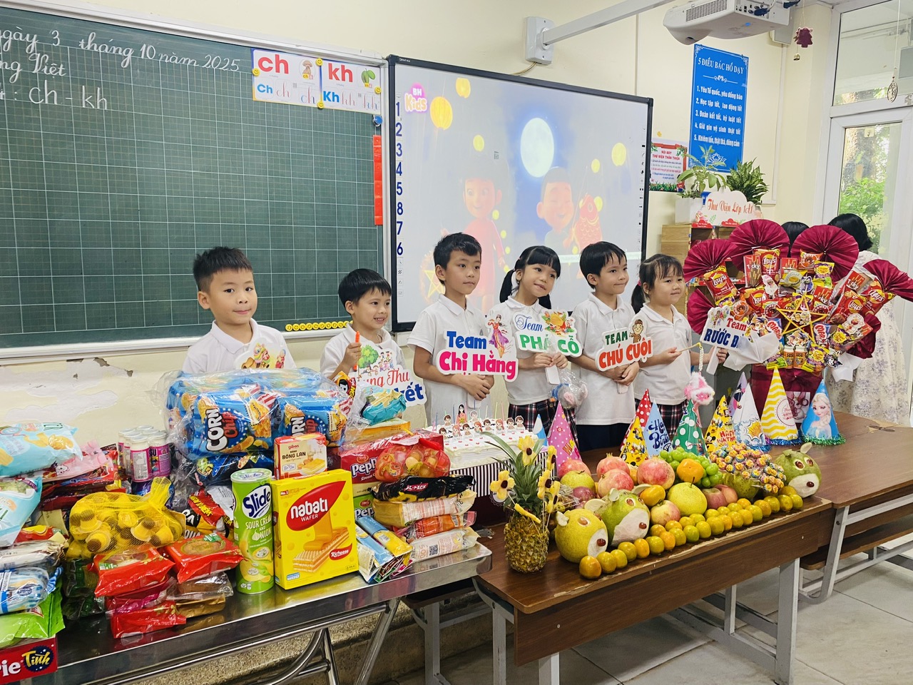 Các em học sinh đupMột trong những phần hấp dẫn nhất là hoạt động phá cỗ Trung thu. Lớp có một mâm cỗ được bày biện đẹp mắt với bánh trung thu, kẹo, trái cây và nhiều món quà nhỏ. Các em cùng nhau quây quần, chia sẻ niềm vui và thưởng thức hương vị ngọt ngào của ngày hội.