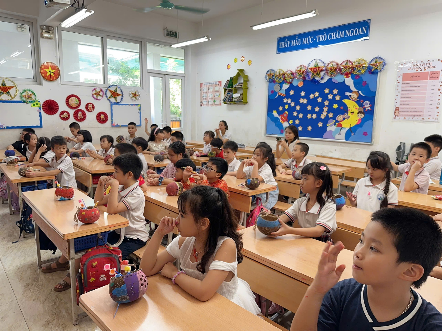 Các bạn cùng nhau sáng tạo trang trí những chiếc đèn lồng xinh xắn từ những chiếc sọ dừa độc đáo. Ai ai cũng háo hức tham gia trò chơi trả lời câu hỏi tìm hiểu về ngày Tết Trung Thu – một hoạt động vừa vui nhộn vừa giúp các em hiểu thêm ý nghĩa của ngày lễ truyền thống này. Mỗi câu trả lời đúng là một niềm hân hoan, và phần thưởng nhỏ xinh chính là món quà động viên, khích lệ tinh thần học hỏi của các em. Bên cạnh đó, các bạn còn được cùng nhau hát múa, múa lân, gặp chú Cuội, chị Hằng, chia sẻ bánh kẹo, và tận hưởng không khí đoàn viên ấm áp ngay trong lớp học. Trong không khí vui tươi ấy, những gương mặt ngây thơ, nụ cười trong sáng của học trò chính là món quà quý giá nhất dành cho thầy cô.
