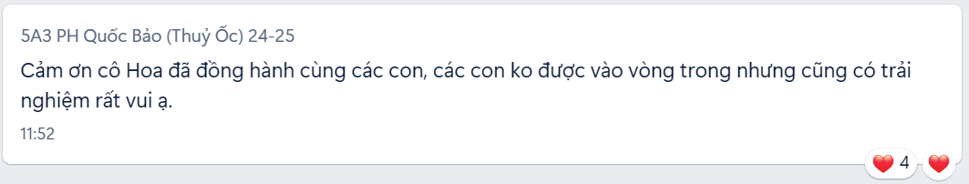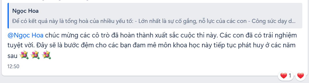Cuộc thi thực sự là một trải nghiệm thú vị, các bạn không chỉ khẳng định được sự đoàn kết, tinh thần giao lưu, học hỏi của học sinh Ba Đình - không ngại khó, không ngại vất vả mà còn chiến thắng chính bản thân mình. Chúc các con sẽ tiếp tục giữ vững tinh thần học hỏi, say mê với khoa học và quyết chiến quyết thắng trong các mùa thi tiếp theo!