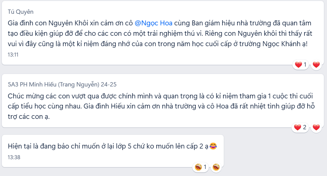 Kết quả chung cuộc, các con dành về 2 giải khuyến khích và 1 giải tập thể Tốt cho trường Tiểu học Ngọc Khánh. Đây chính là “quả ngọt” của sự cố gắng và đoàn kết của các con!