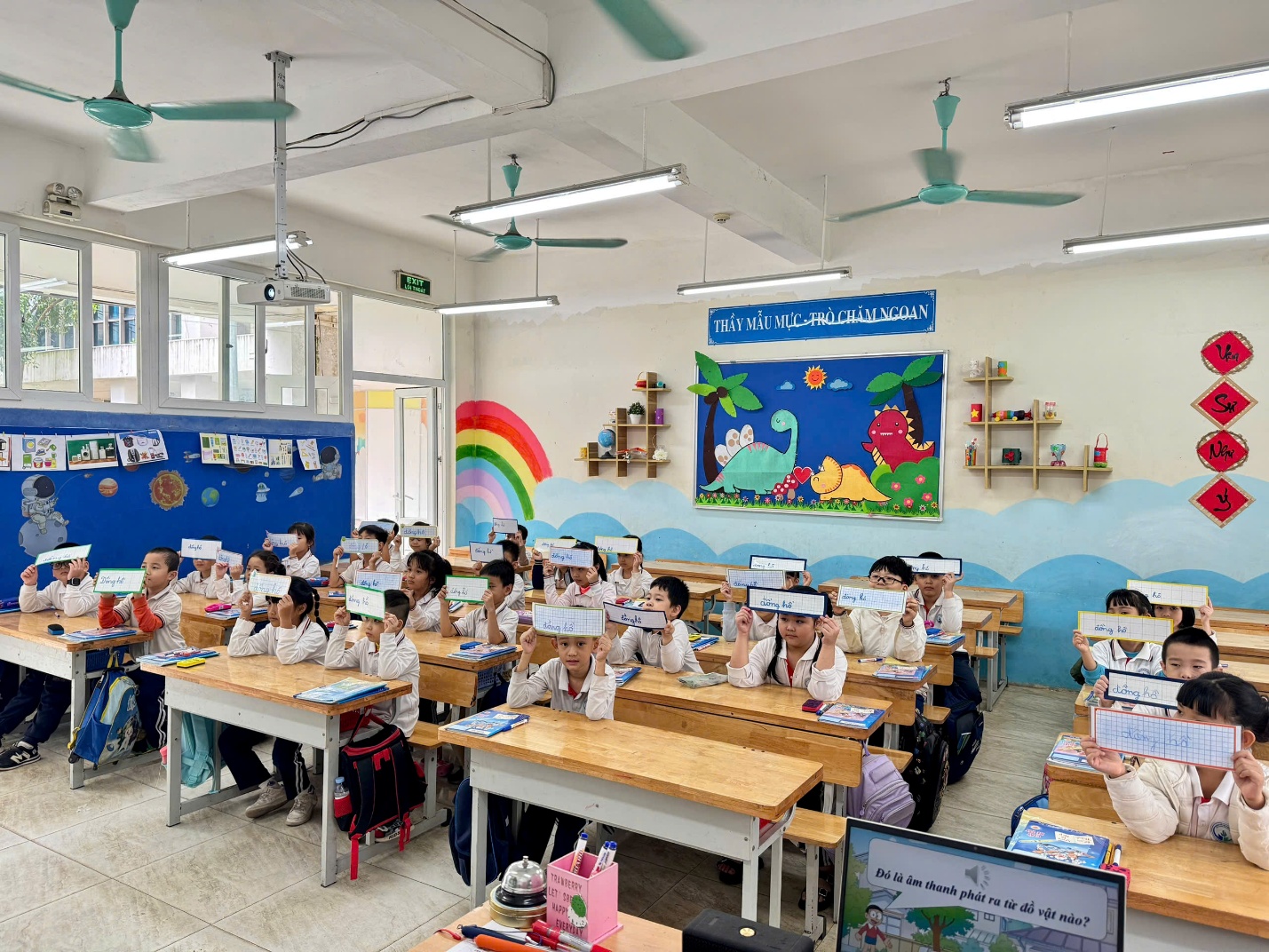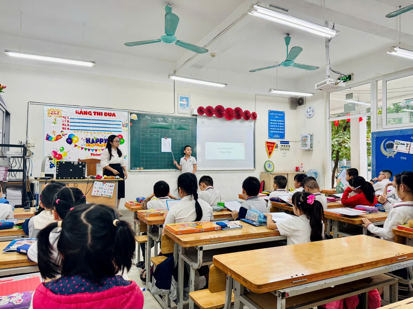 Mở đầu là tiết Tiếng Việt (phân môn Luyện từ và câu) của cô giáo Vũ Hoàng Anh. Với nội dung "Mở rộng vốn từ: Từ ngữ về đồ dùng học tập, đồ dùng gia đình, công dụng của chúng" và "Ôn tập câu nêu đặc điểm", cô giáo đã khéo léo tổ chức các hoạt động học tập đa dạng, sáng tạo. Không khí lớp học diễn ra vô cùng sôi nổi, các em học sinh hào hứng, tích cực tham gia xây dựng bài và tiếp thu kiến thức một cách chủ động.