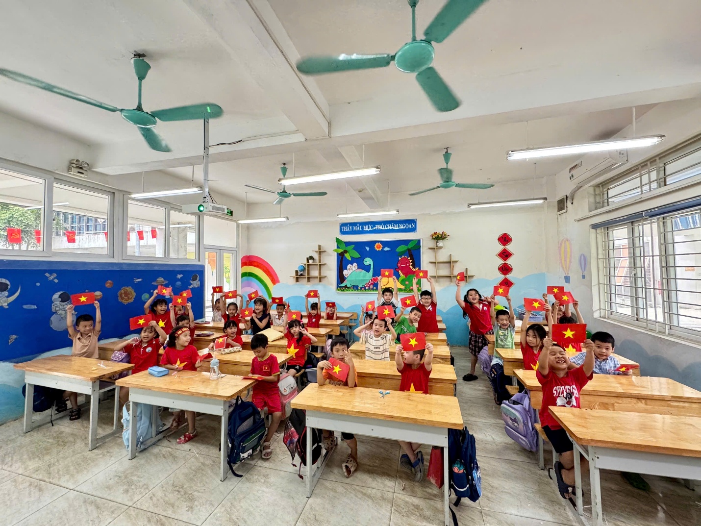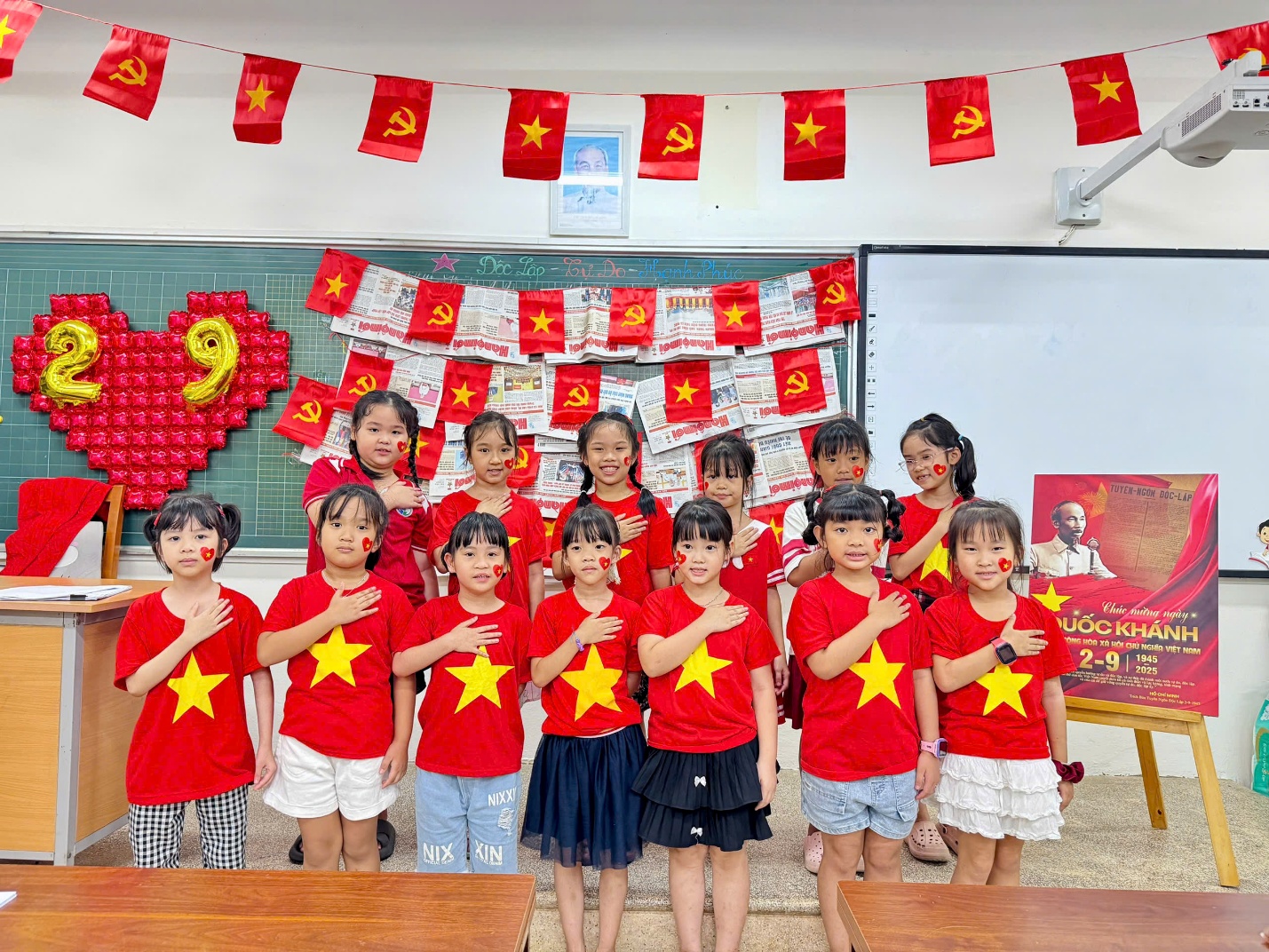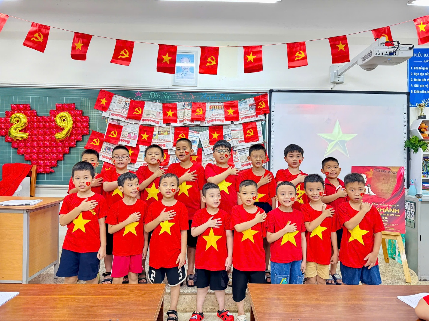 Không gian lớp học được tô điểm bằng cờ, hoa, tranh ảnh lịch sử, tạo không khí rộn ràng, trang trọng để chào mừng ngày lễ lớn.