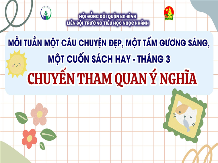 Sáng ngày 10/3/2025, trong tiết Sinh hoạt dưới cờ, Liên đội trường TH Ngọc Khánh đã chia sẻ đến các con học sinh toàn trường “Mỗi tuần một câu chuyện đẹp, một tấm gương sáng, một cuốn sách hay” tháng 3 với câu chuyện “Chuyến tham quan ý nghĩa”.
