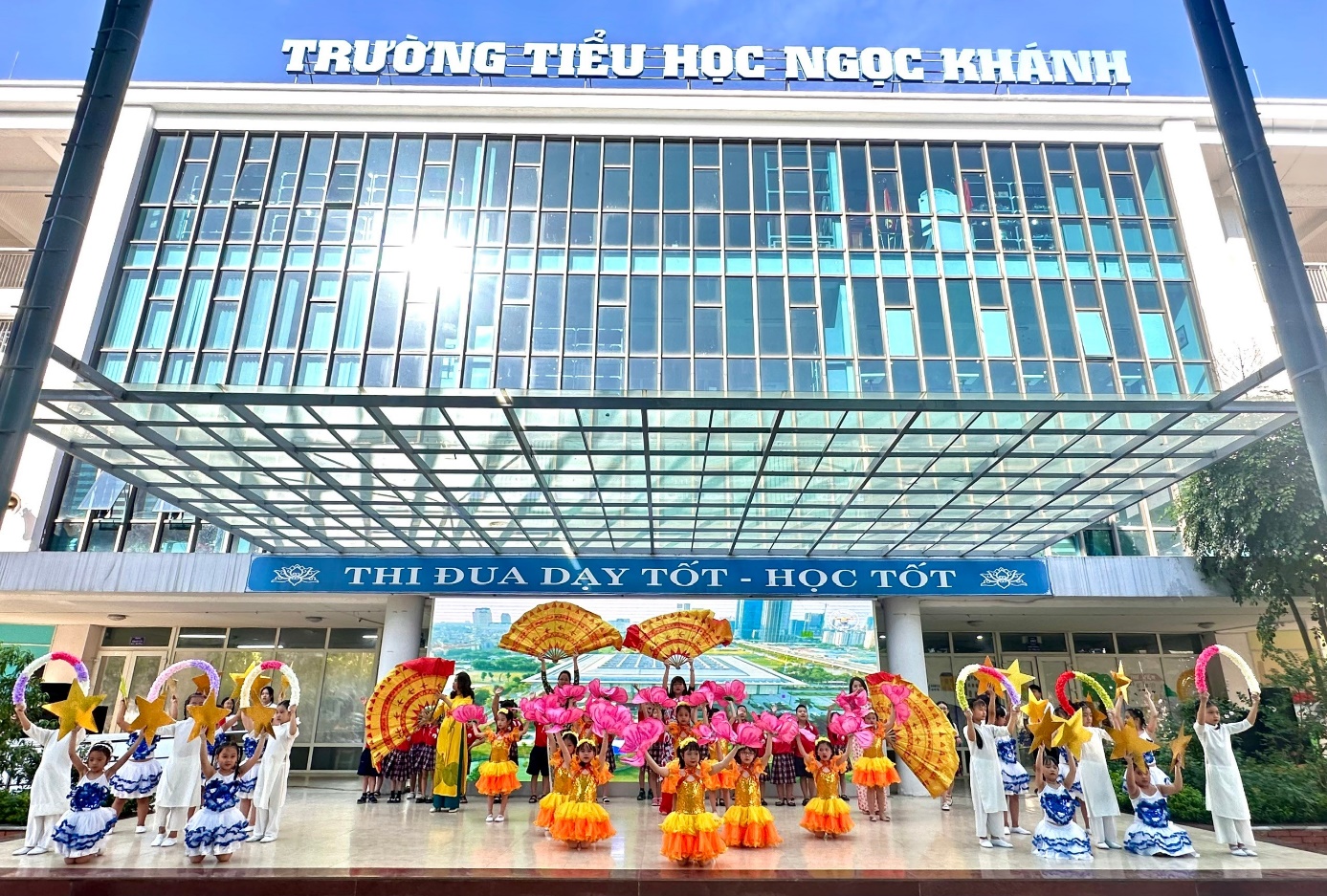 Sáng ngày 28 tháng 4, trong tiết trời trong xanh của cuối tháng Tư lịch sử, sân trường Tiểu học Ngọc Khánh như bừng sáng giữa muôn sắc cờ hoa. Cả ngôi trường rực rỡ, phấp phới băng rôn, cờ đỏ sao vàng, không khí tưng bừng, rộn rã tràn ngập khắp các nẻo sân trường.