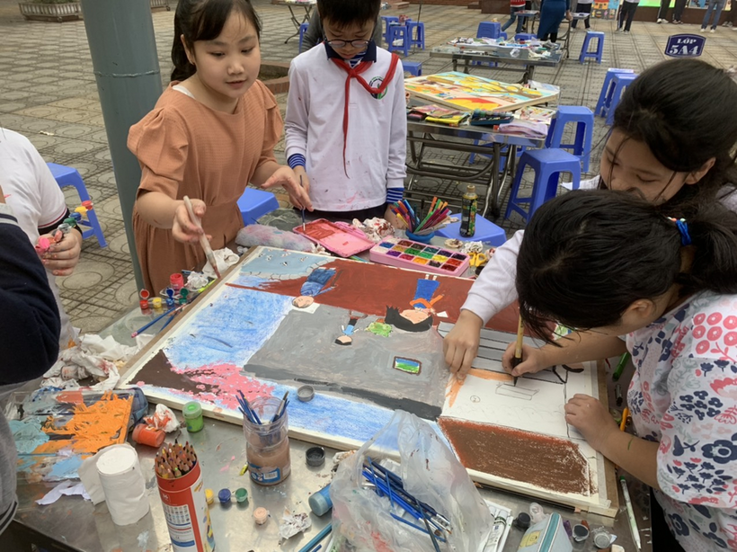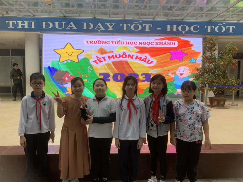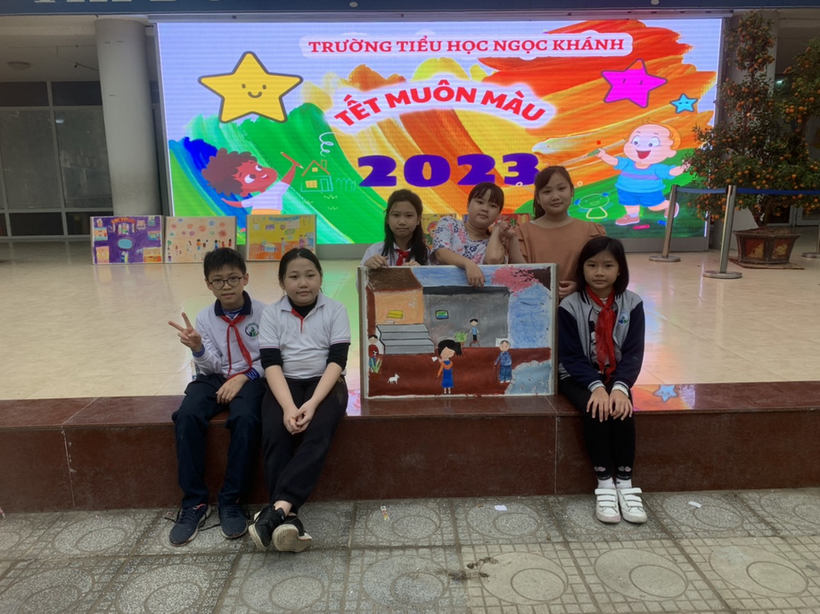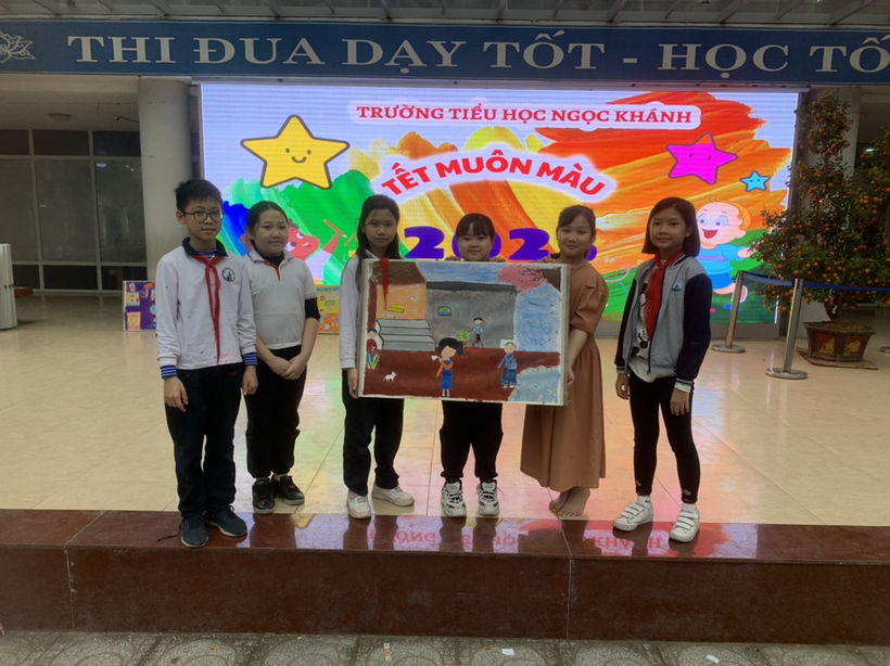 Mùa xuân là mùa của cây cối đâm chồi nảy lộc cũng là lúc mà ai ai cũng mong chờ cái Tết sum vầy. Tết về nhuộm đầy những sắc màu từ nhà ra phố. Tết trong mắt mỗi người, mỗi nhà đều có những màu sắc riêng. Có thể là màu của chợ hoa rực rõ, màu của những tấm áo mới mẹ mua, màu của kẹo mứt hạt dưa được bày lên bàn tiếp khách… Tết là ngày hội của sắc màu, của yêu thương đong đầy và hạnh phúc ngập tràn. Để truyền tải được màu sắc của Tết liên đội trường Tiểu học Ngọc Khánh đã tổ chức cuộc thi “Tết muôn màu” giữa các lớp khối 4 và 5 trong nhà trường. Lớp 5A2 đã chọn được 6 bạn học sinh tham gia cuộc thi. Các bạn nhỏ rất thích thú với hoạt động này nên ai cũng cố gắng hoàn thiện bức tranh của lớp mình thật tốt. Trong thời gian 2 tiếng cả 6 bạn đã vẽ xong bức tranh của mình với niềm vui và hứng khởi. Tuy nét vẽ của các bạn còn ngây ngô nhưng cũng thể hiện được cái nhìn độc đáo của các bạn về màu sắc của Tết. Bức tranh thể hiện sự hân hoan, vui mừng, háo hức của tất cả mọi người cùng nhau dọn dẹp nhà cửa tươm tất mỗi dịp Tết đến xuân về. Dưới đây là một số hình ảnh của các bạn học sinh lớp 5A2 trong cuộc thi: